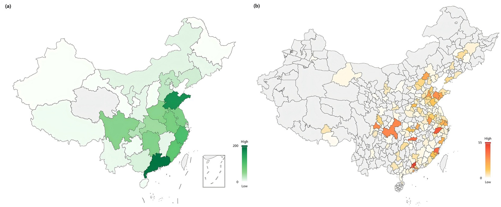 Figure 2. Presents a geographical heatmap of RTC foods patent distribution in China (2018–2025). (a) Provincial-level distribution: The color gradient represents the volume of patent applications across provinces, autonomous regions, and municipalities directly under the central government, with the darkest shade indicating Guangdong Province as the top applicant (197 patents). (b) Municipal-level distribution: The chromatic intensity corresponds to application numbers at prefecture-level cities, where Guangzhou City emerges as the leading innovator (53 patents), depicted in the deepest hue.