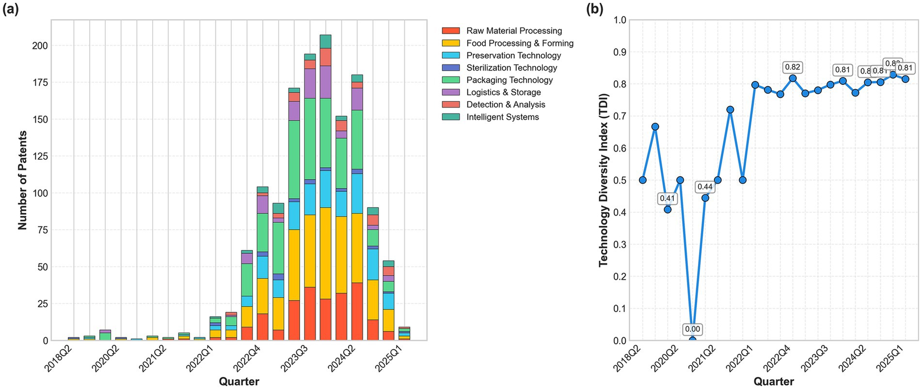 Figure 3. Quarterly distribution and diversity evolution trends of RTC foods patent innovations. (a) Stacked area chart of quarterly patent distribution by technical domain. (b) Quarterly variation trends of the Technological Diversity Index (TDI).