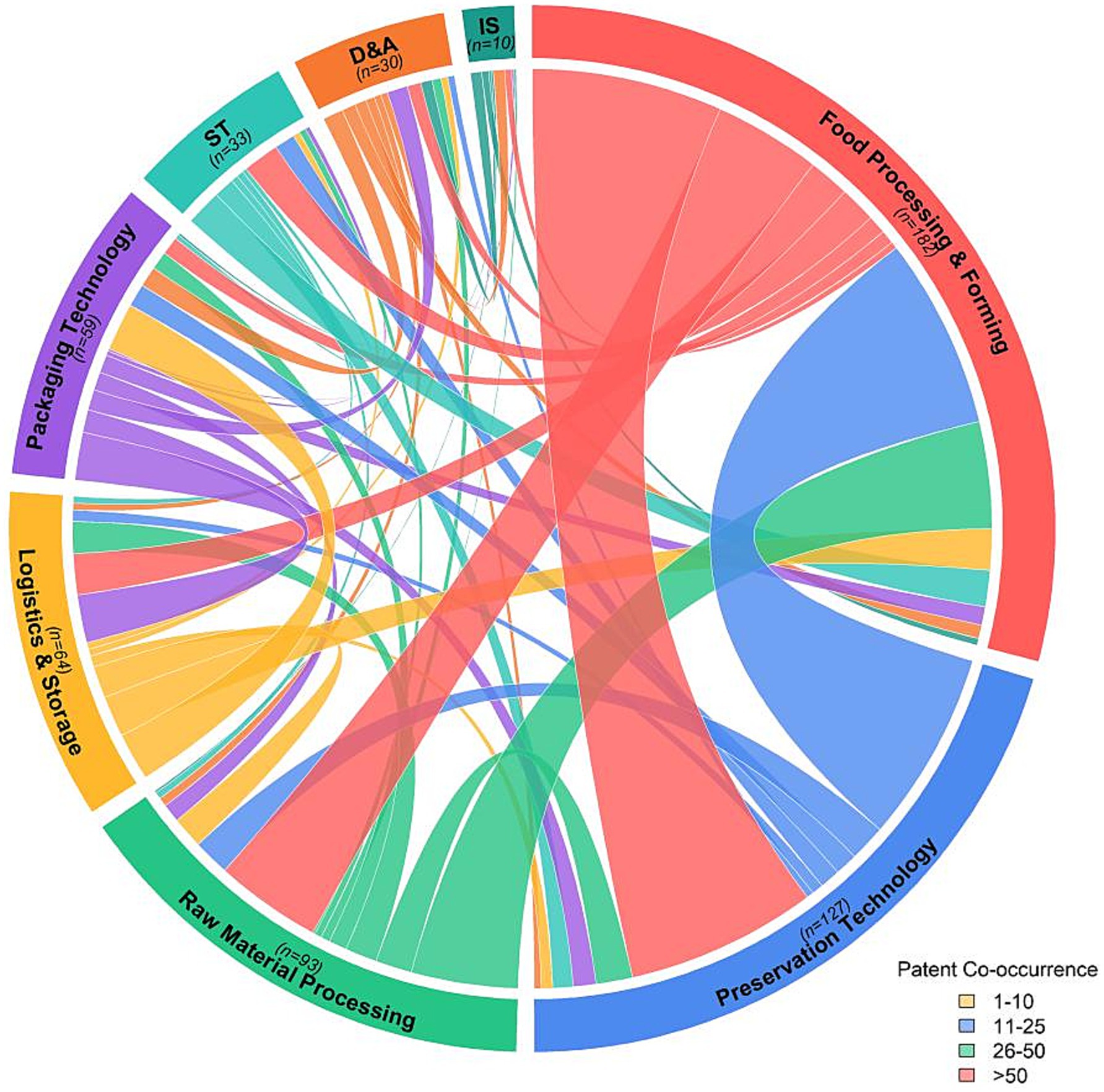 Figure 4. The associated chord diagram of technological fields in the RTC foods industry. Nodes represent different technological fields. The width of the connecting lines reflects the intensity of patent co-occurrence, and the numbers indicate the total quantity of patent co-occurrences in each technological field. D&A, Detection and Analysis Technology; IS, Intelligent Systems Technology; ST, Sterilization Technology.
