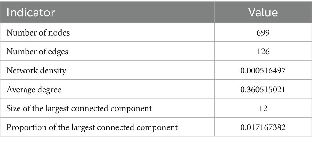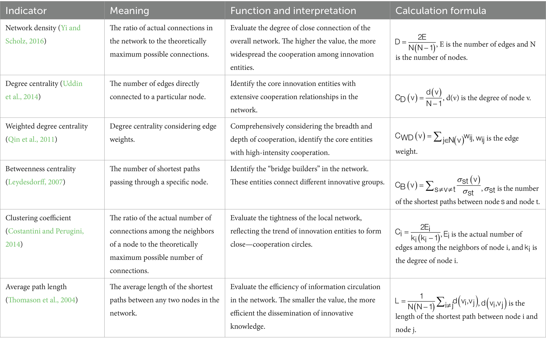 To characterize the collaboration network structure, we calculated multiple network metrics (detailed in Table 1), including network density, degree centrality, betweenness centrality, and clustering coefficient, to reveal both global structural features and key nodes. The computation of these metrics was conducted using Python (v3.9) with the NetworkX library, a standard tool for complex network analysis. To identify tightly-knit innovation communities, the Louvain community detection algorithm was applied (Chu and Ding, 2021). This algorithm was specifically chosen for its computational efficiency and robust performance in identifying community structures within large and potentially fragmented networks, which is characteristic of our dataset. Finally, all network visualizations presented in this study were generated using R (v4.2) with the ggraph and ggplot2 packages to ensure high-quality graphical representation.