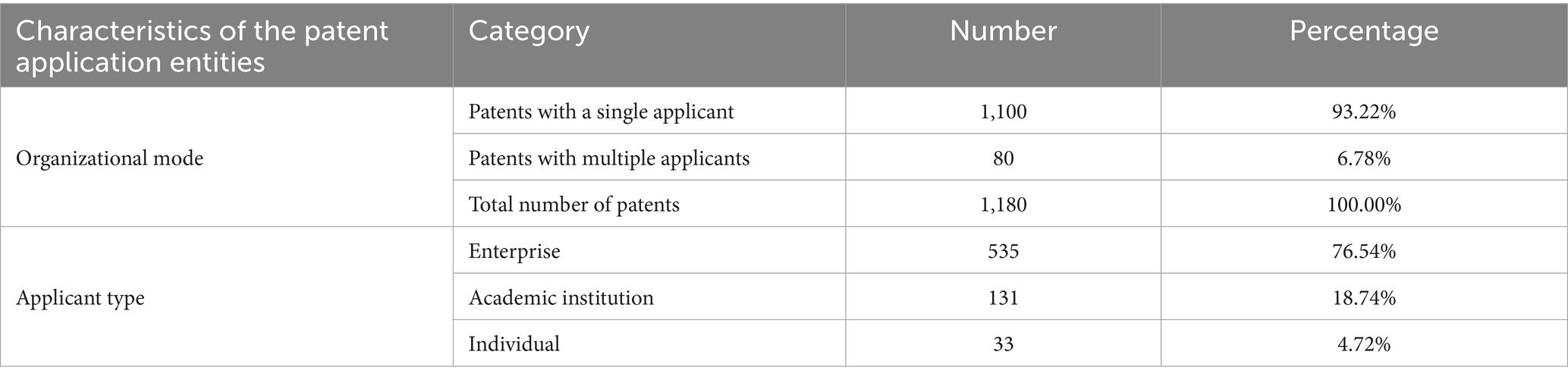 In terms of the classification of patent applicants, this study divides innovative entities into five types according to the nature of the application entities: state-owned enterprises, private enterprises, universities, scientific research institutes, and individuals. Moreover, an applicant-patent bipartite network is constructed to provide data support for the subsequent analysis of the collaborative innovation network among industry, academia, and research institutions. Regarding geographical information, patents are coded according to the provinces and cities where the applicants are located, which is used for the analysis of the regional innovation pattern.