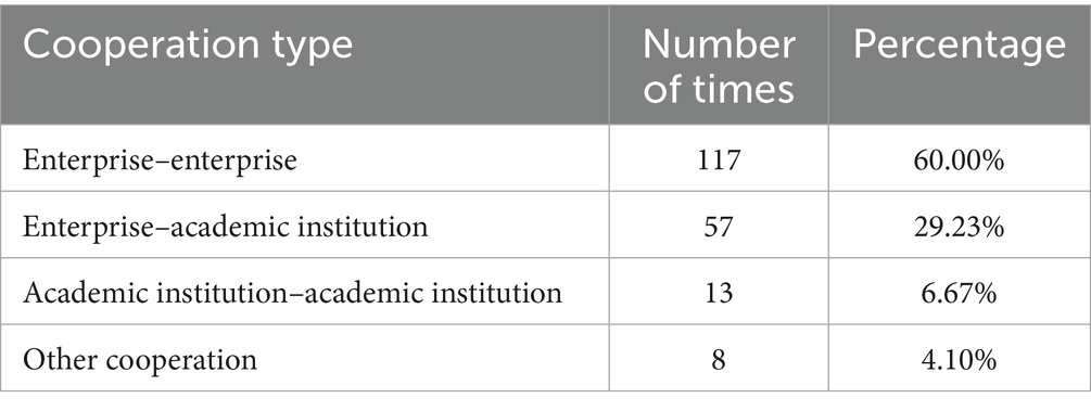 The distribution of cooperation types is shown in Table 5. In the RTC foods industry, innovation cooperation is mainly dominated by cooperation among enterprises (60.00%), followed by industry-university cooperation (29.23%), and cooperation among academic institutions accounts for a relatively small proportion (6.67%). This structural characteristic indicates that innovation in the RTC foods industry mainly relies on industrial chain cooperation and market synergy among enterprises, while academic institutions mainly industrialize scientific research results through cooperation with enterprises.