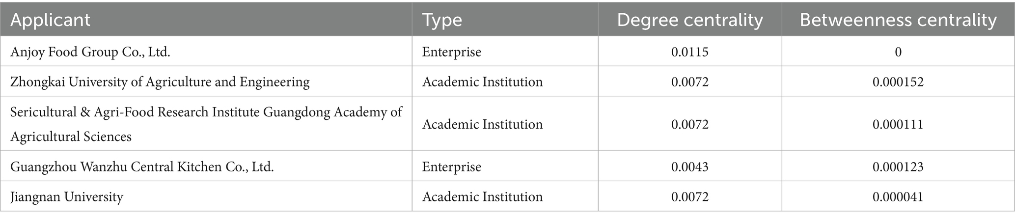 By calculating the network centrality indicators, the core entities and their influence in the innovation network of the RTC foods industry can be identified. Table 6 lists the innovative entities with the highest degree centrality and betweenness centrality.