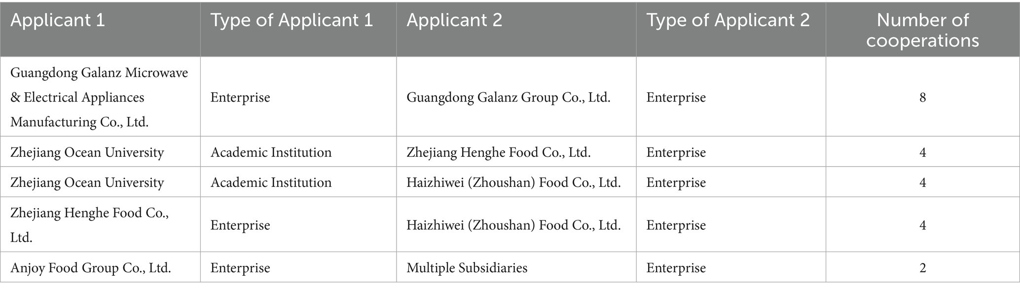 Collaborative innovation among industry, academia, and research institutions constitutes the second important path for knowledge flow in the RTC foods industry (Wu et al., 2022). Represented by the high-frequency cooperation (4 times) between Zhejiang Ocean University and Zhejiang Henghe Food, as well as Haizhiwei Food, the transformation and application of university research results to enterprises have been achieved through industry-academia cooperation. This model is particularly prominent in the field of marine food processing, where a positive interaction has been formed between the basic research of universities and the application needs of enterprises. Similar cooperations include those between Huazhong Agricultural University and Guigang Xinshiji Food, and between Zhejiang Marine Fisheries Research Institute and Zhoushan Marine Fisheries of China. All these indicate that agricultural universities and research institutions provide important technical support in the processing of specific raw materials for RTC foods.