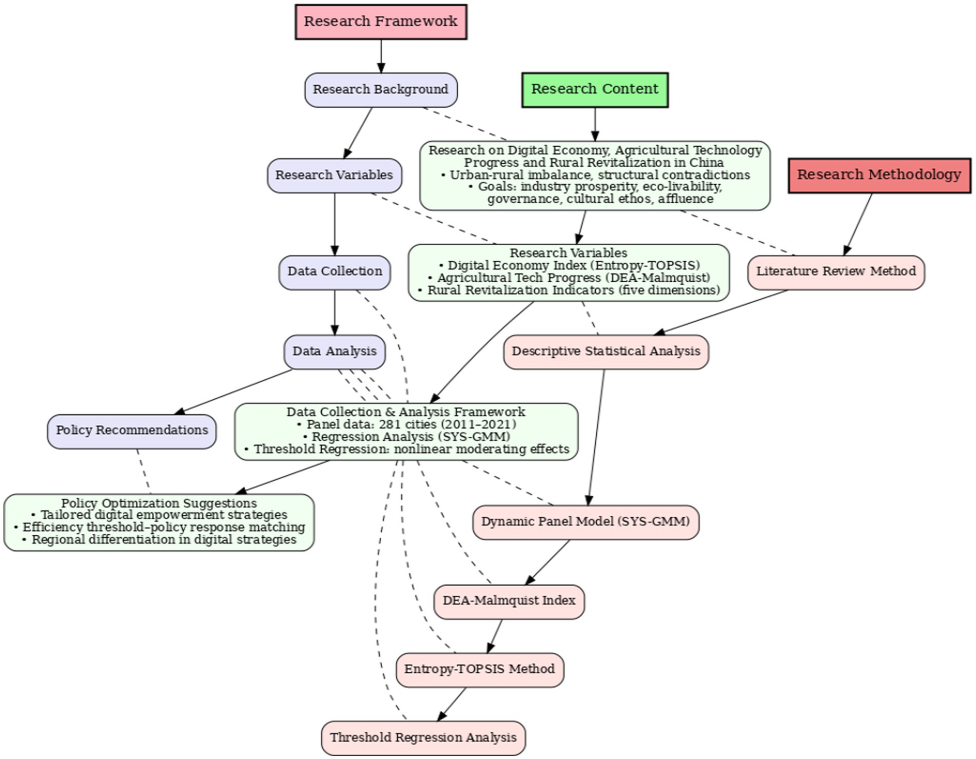 This study integrates the theories of network externalities, human capital, and threshold effects to systematically analyze the dynamic interlinkages among digital economic development, agricultural technological progress, and rural revitalization. Based on panel data from 281 prefecture-level and above cities in China during the period of 2011–2021, we construct a rural revitalization evaluation system encompassing five dimensions: prosperous industry, eco-friendly and livable environment, civilized rural ethos, effective governance, and affluent living standards. The entropy method is employed for the synthesis of multiple indicators. In terms of methodology, this study innovatively combines the DEA-Malmquist index to decompose the types of agricultural technological progress. The dynamic panel model (SYS-GMM) is utilized to capture the lagged effects, and threshold regression is employed to reveal the critical threshold of technical efficiency.