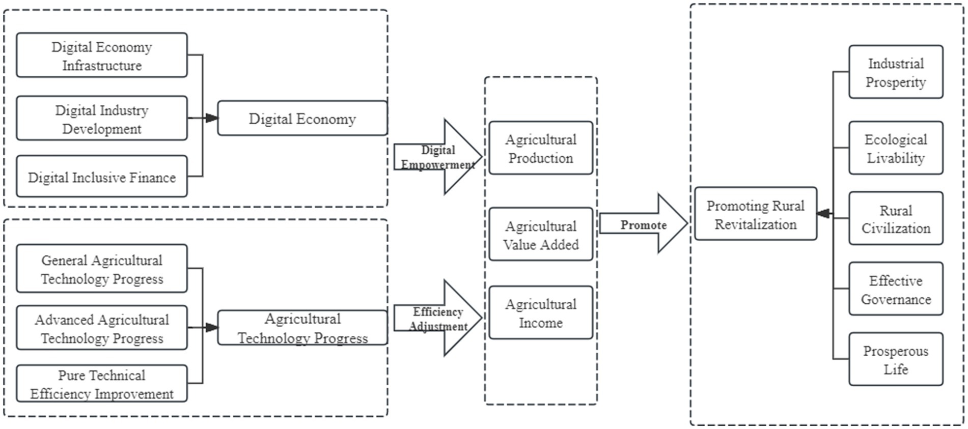 In the current economic environment, the digital economy has become a key force driving global economic growth (Zhang et al., 2022). The digital economy is primarily built on the foundation of digital information and communication technologies, including the internet, big data, and other technological fields (Li J. et al., 2022). These technologies not only transform the way traditional industries operate but also open up new pathways for rural revitalization.