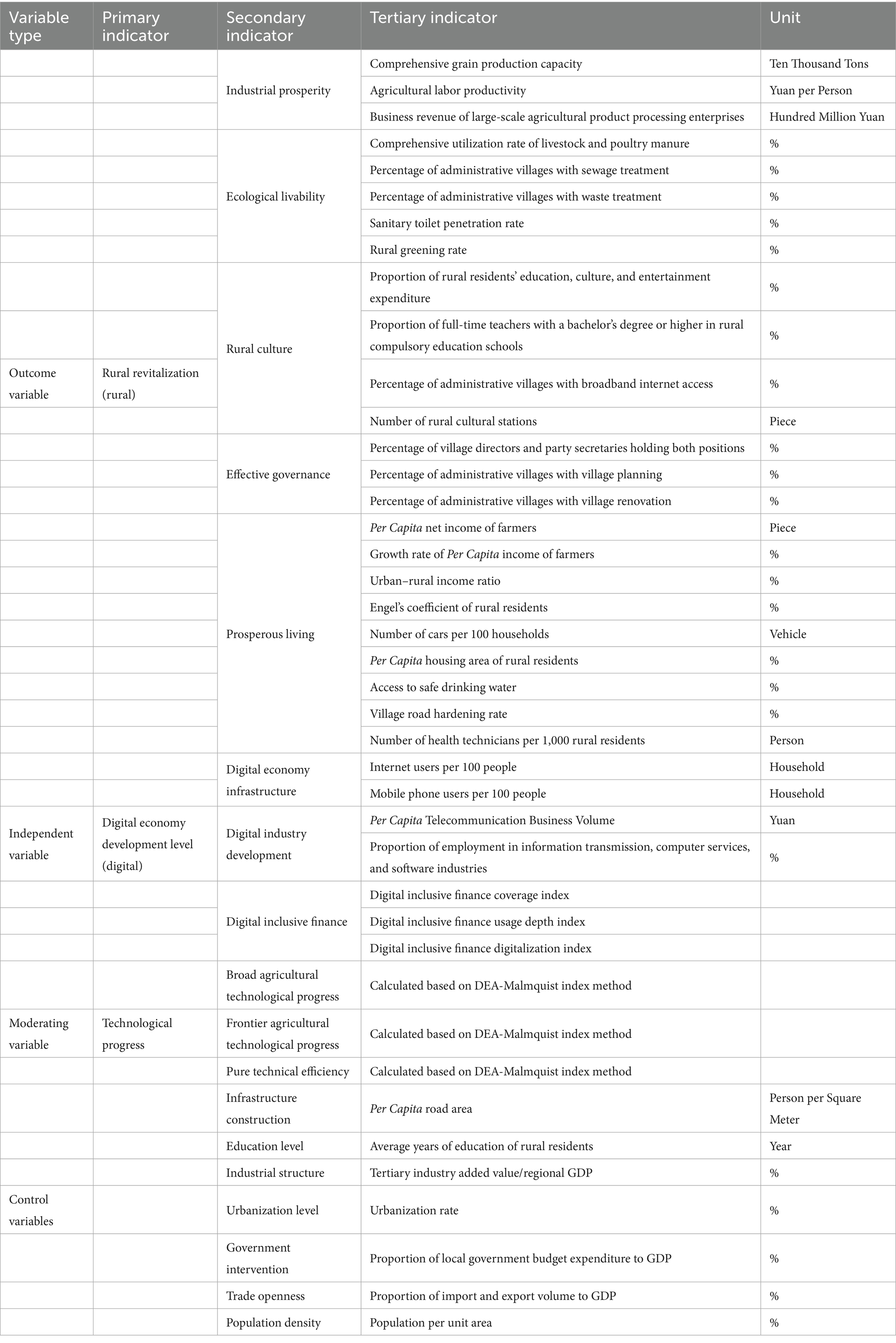 The outcome variable was rural revitalization. This study adopts rural revitalization as the core outcome variable, consistent with the “Rural Revitalization Strategic Plan (2018–2022)” issued by the Chinese government, which emphasizes comprehensive and balanced development in five key areas: prosperous industries, eco-friendly living, civilized rural culture, effective governance, and prosperous livelihoods. These five dimensions reflect both the economic and social goals of rural transformation and have been widely recognized in academic studies as the essential components of sustainable rural development (Yang et al., 2022; Geng et al., 2024).