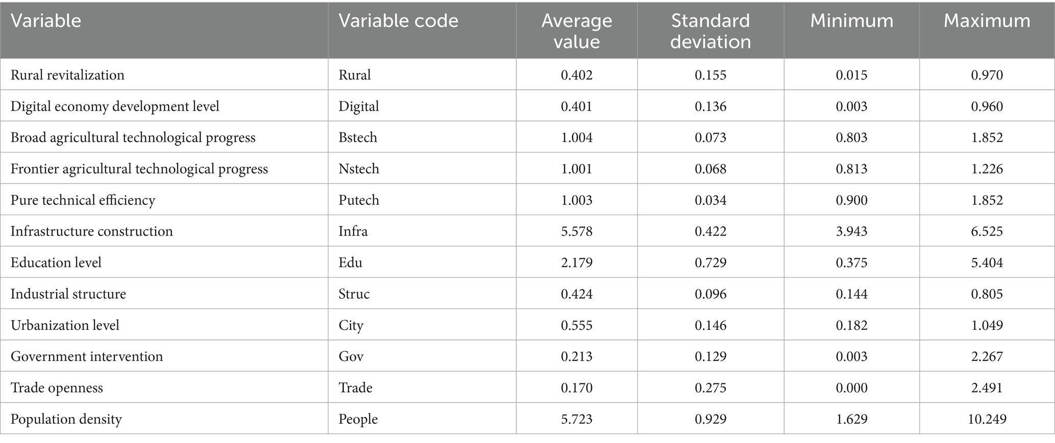 The moderating variable was technological progress. Peng and Gao (2023), who used the output-oriented DEA-Malmquist index method based on variable returns to scale to measure the growth and decomposition of agricultural technological progress, this study categorizes it into broad agricultural technological progress (bstech), frontier agricultural technological progress (nstech), and pure technical efficiency (putech). In terms of output, the selection of variables is as follows: the total output value of agriculture, forestry, animal husbandry, and fishery is used to represent output; labor input is represented by the number of employees in agriculture, forestry, animal husbandry, and fishery; agricultural machinery input is measured by the per capita total agricultural machinery horsepower; land input is reflected by the total sown area of crops; and the fertilizer input indicator is the amount of pesticide and fertilizer applied.