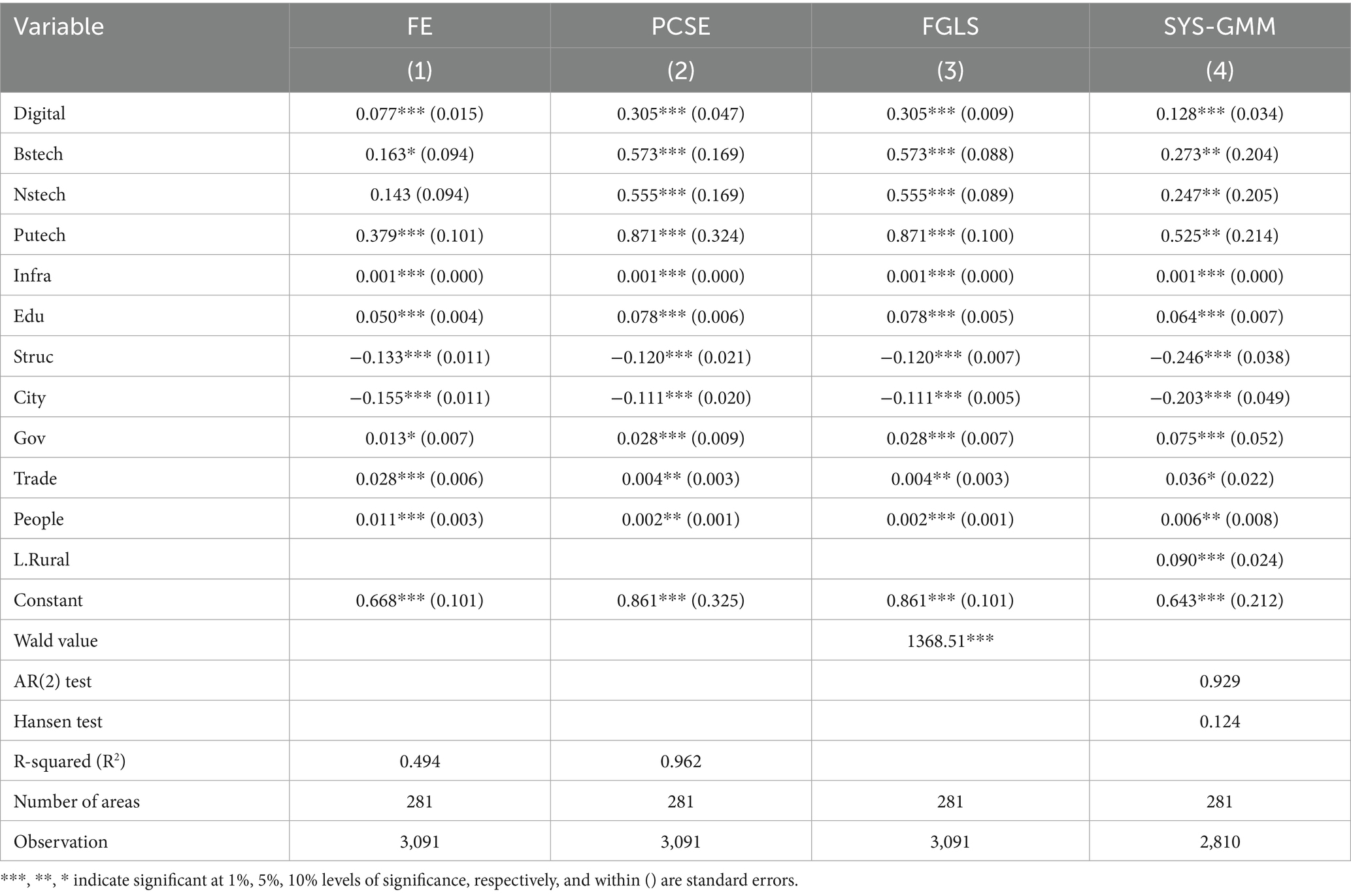 According to the descriptive statistical results presented in Table 2, significant regional disparities are observed across the variables. Specifically, variables such as rural revitalization (Rural) and digital economy development level (Digital) exhibit relatively low mean values of 0.402 and 0.401, respectively, coupled with large standard deviations, indicating considerable variation in development across regions. In contrast, agricultural technological progress (Bstech and Nstech) and pure technical efficiency (Putech) display smaller standard deviations, suggesting more balanced development and smaller regional differences in these areas. Infrastructure construction (Infra) and industrial structure (Struc) have higher mean values, 5.578 and 2.272, respectively, reflecting relatively well-developed infrastructure and industrial systems in certain regions. On the other hand, education level (Edu) and urbanization level (City) show large standard deviations, indicating substantial regional differences in these dimensions. Government intervention (Gov) and trade openness (Trade) exhibit relatively low mean values, with small standard deviations, implying that most regions experience low levels of government intervention and trade openness with limited variation. Finally, population density (people) shows a high standard deviation of 0.929, indicating significant disparities, with some regions experiencing high population densities while others are relatively sparse.