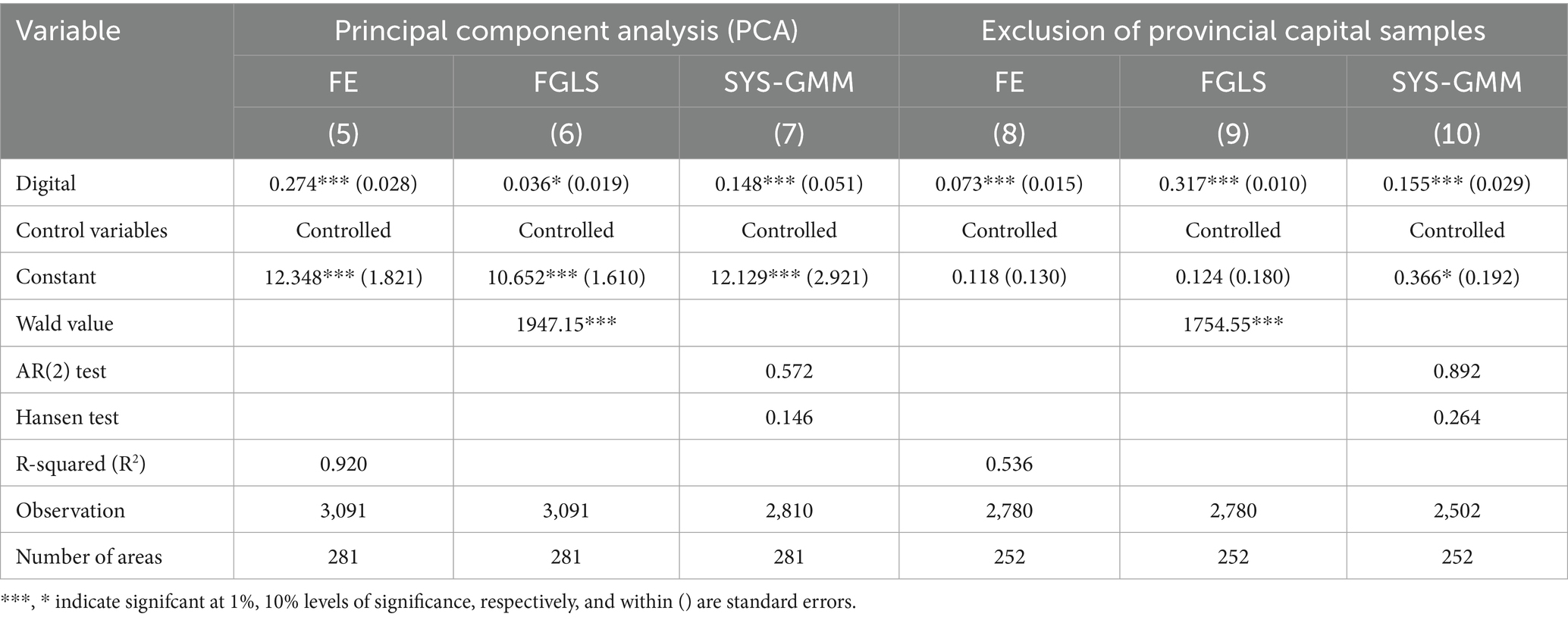 First, we replaced the measurement methods for the core explanatory variables and the explained variables. Following the approach of Zhao et al. (2020), the levels of digital economy development and rural revitalization were re-measured. Unlike the entropy method used previously to determine the weights of the secondary indicators for digital economy development and rural revitalization, the robustness check adopted principal component analysis (PCA)—an objective method for weight distribution. This allowed for the reallocation of weights for the secondary indicators and the construction of new composite indices for both digital economy and rural revitalization.