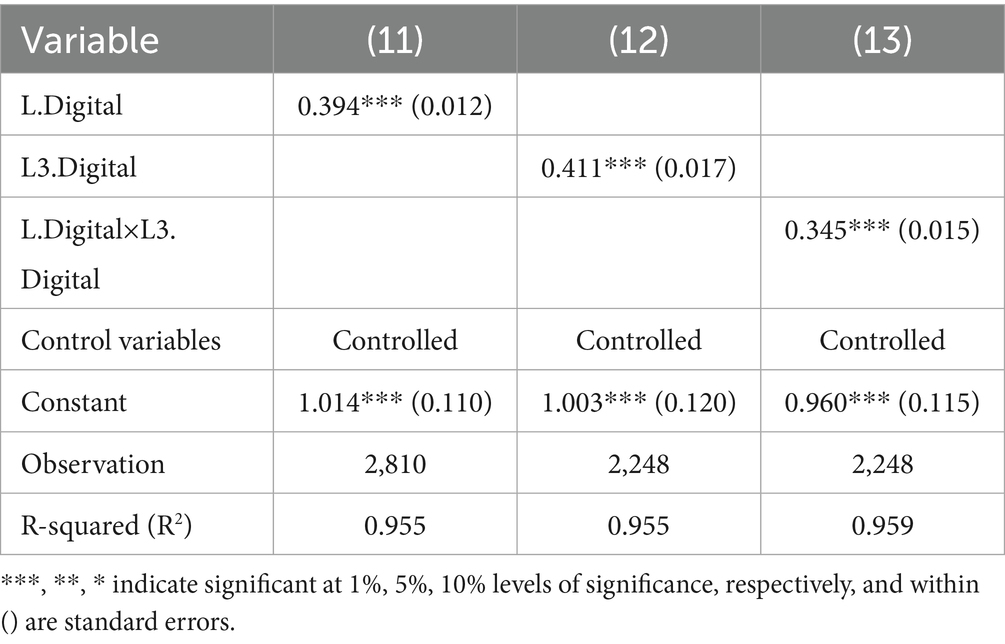 Drawing on the methodology of Chen et al. (2024), this study utilizes the lagged one-period and lagged three-period indicators of digital economy development level as instrumental variables and applies the two-stage least squares (2SLS) method for model estimation. As shown in Table 5, the lagged one-period (L.Digital) and lagged three-period (L3.Digital) digital economy indicators are used as instrumental variables for estimation. Columns (11) and (12) in Table 5 present the estimation results using these two instrumental variables, while Column (13) shows the results when both instrumental variables are used simultaneously. The results in the table indicate that the estimated coefficients are largely consistent with those from the baseline regression, suggesting that the endogeneity issue has minimal impact on the empirical findings of this study. This further affirms the robustness of the results.