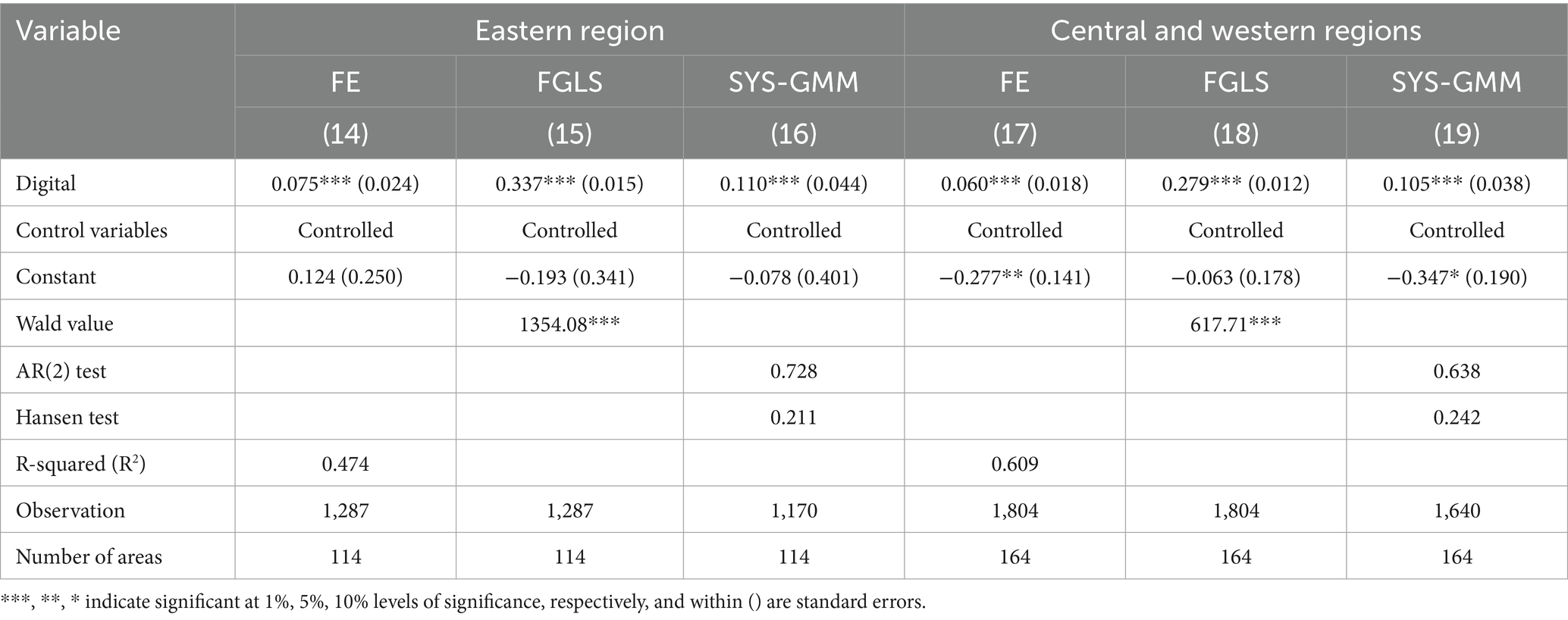 Although the previous regression analysis was conducted using national data, it is evident that there are significant regional differences in economic development levels and digital economic infrastructure. To further explore this heterogeneity, this study divides the 281 sample cities into two regions: the Eastern and Central/Western regions. The impact of the digital economy on rural revitalization in these two regions is analyzed separately.