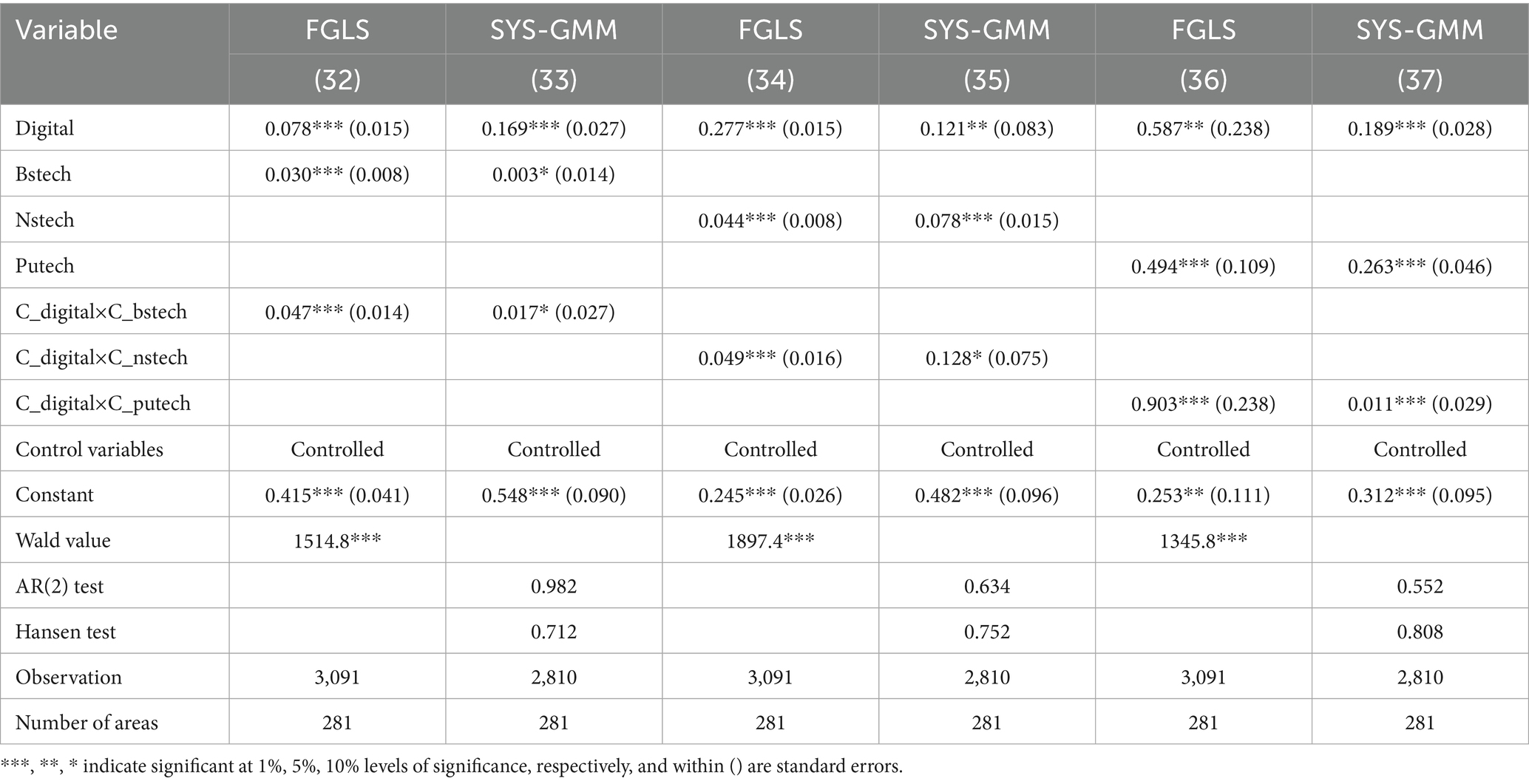 The findings reveal that generalized agricultural technological progress, frontier agricultural technology advancements, and pure technical efficiency are significant at least at the 10% level in both the static and dynamic models, and all have a positive effect. This indicates that these factors significantly moderate the impact of digital economy on rural revitalization, thereby validating research hypotheses H2, H3, and H4. However, in terms of significance and estimation coefficients, the improvement in pure technical efficiency has a greater moderating effect on the digital economy’s promotion of rural revitalization.