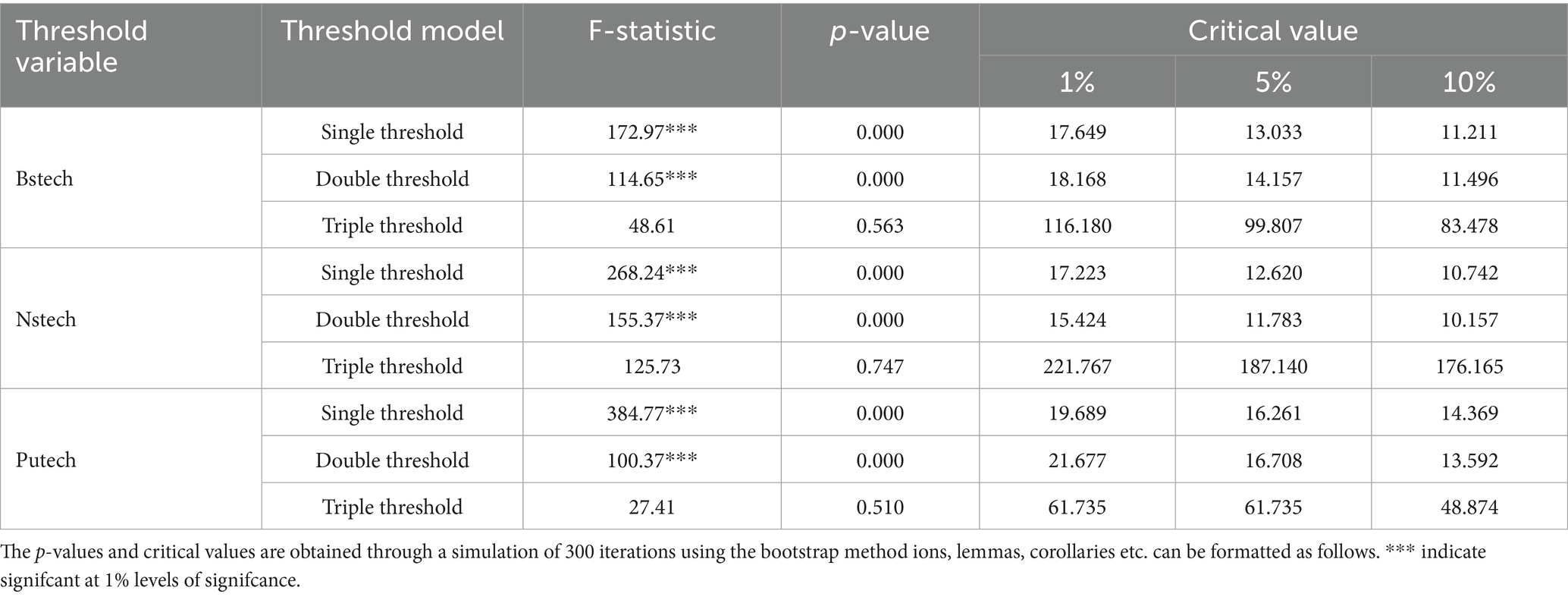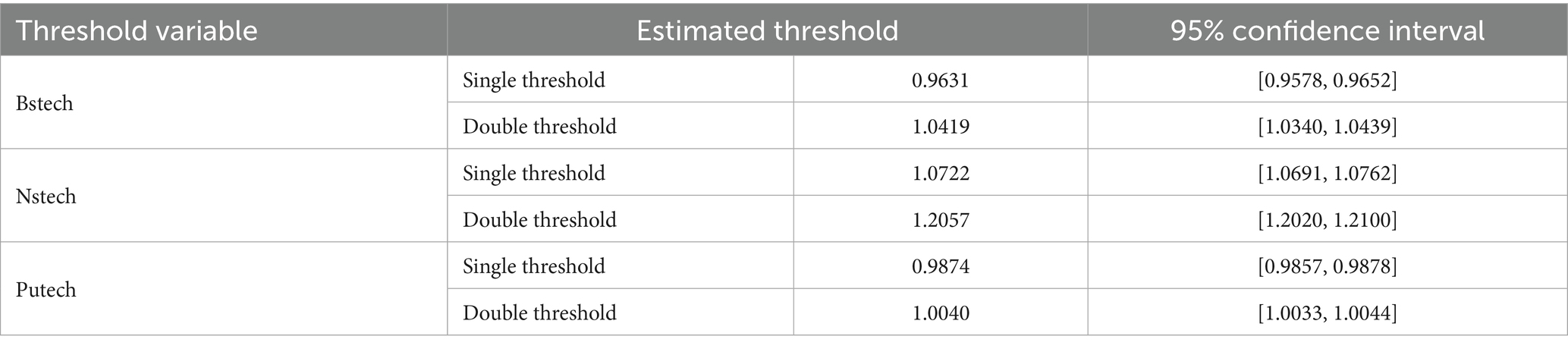 The threshold effect refers to the phenomenon where the impact of a factor (such as technological progress) on another factor (such as rural revitalization) is not linear but becomes more significant once a critical point is reached (Ali et al., 2023). According to Rogers’ (1976) theory of “Diffusion of Innovations,” the adoption of new technologies follows a gradual process from early adopters to laggards. Only when the “critical mass” is reached does the diffusion accelerate, thereby amplifying the overall impact. In this sense, agricultural technological progress—whether in the form of broad advances, frontier innovations, or technical efficiency—may display threshold effects in the digital economy’s promotion of rural revitalization.
