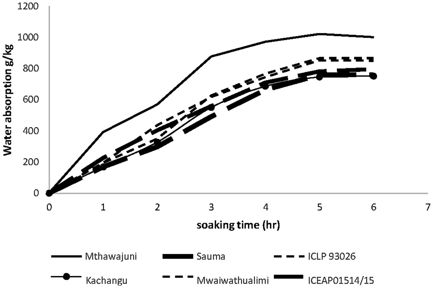 Among whole seeds, Mthawajuni demonstrated the highest water uptake capacity, achieving rapid initial absorption within the first hour and maintaining superior hydration throughout the 6-h soaking period (1,000 g kg−1). Four varieties (Mwaiwathualimi, Kachangu, Mthawajuni, and ICEAP93026) exhibited biphasic absorption patterns characterized by accelerated initial uptake followed by equilibrium after 5 h (Figure 1). This hydration behavior aligns with established mechanisms whereby water imbibition in legumes is governed by seed physical characteristics and macromolecular composition, particularly protein content (Wiraguna, 2022).