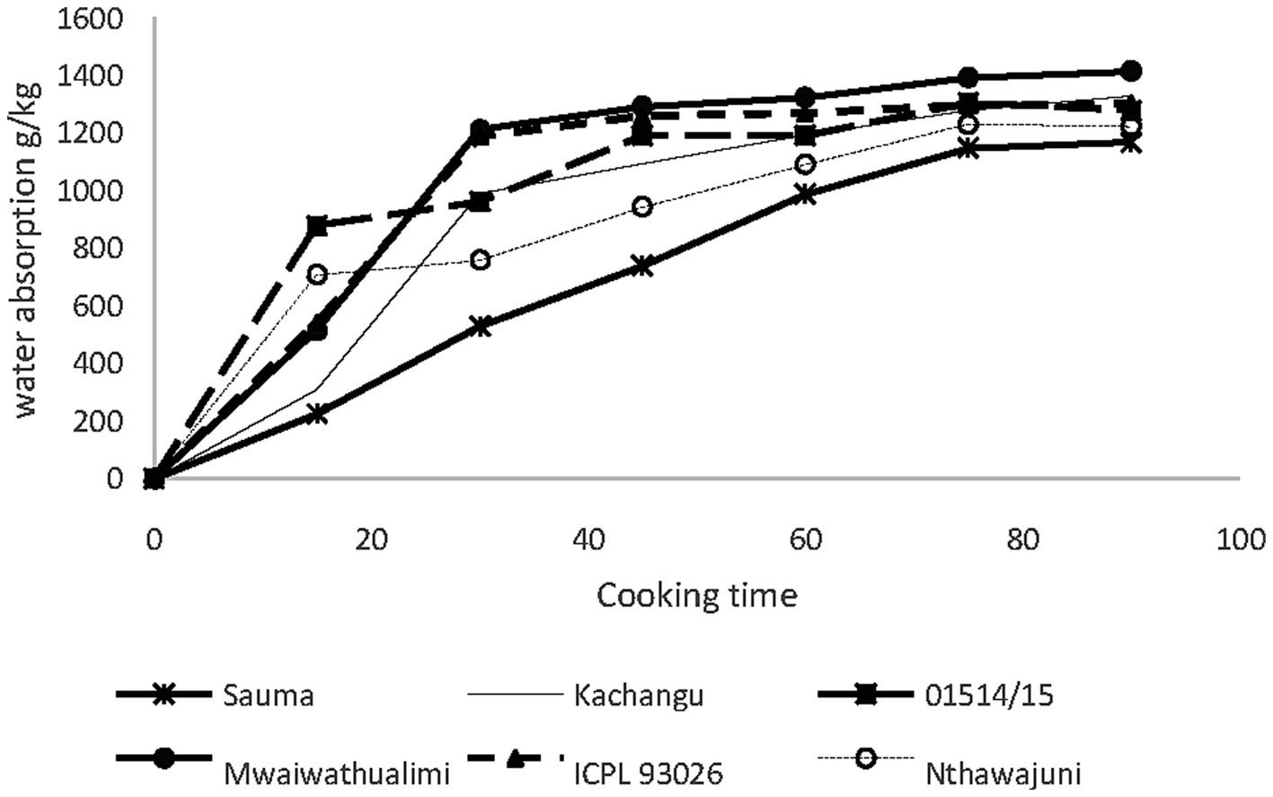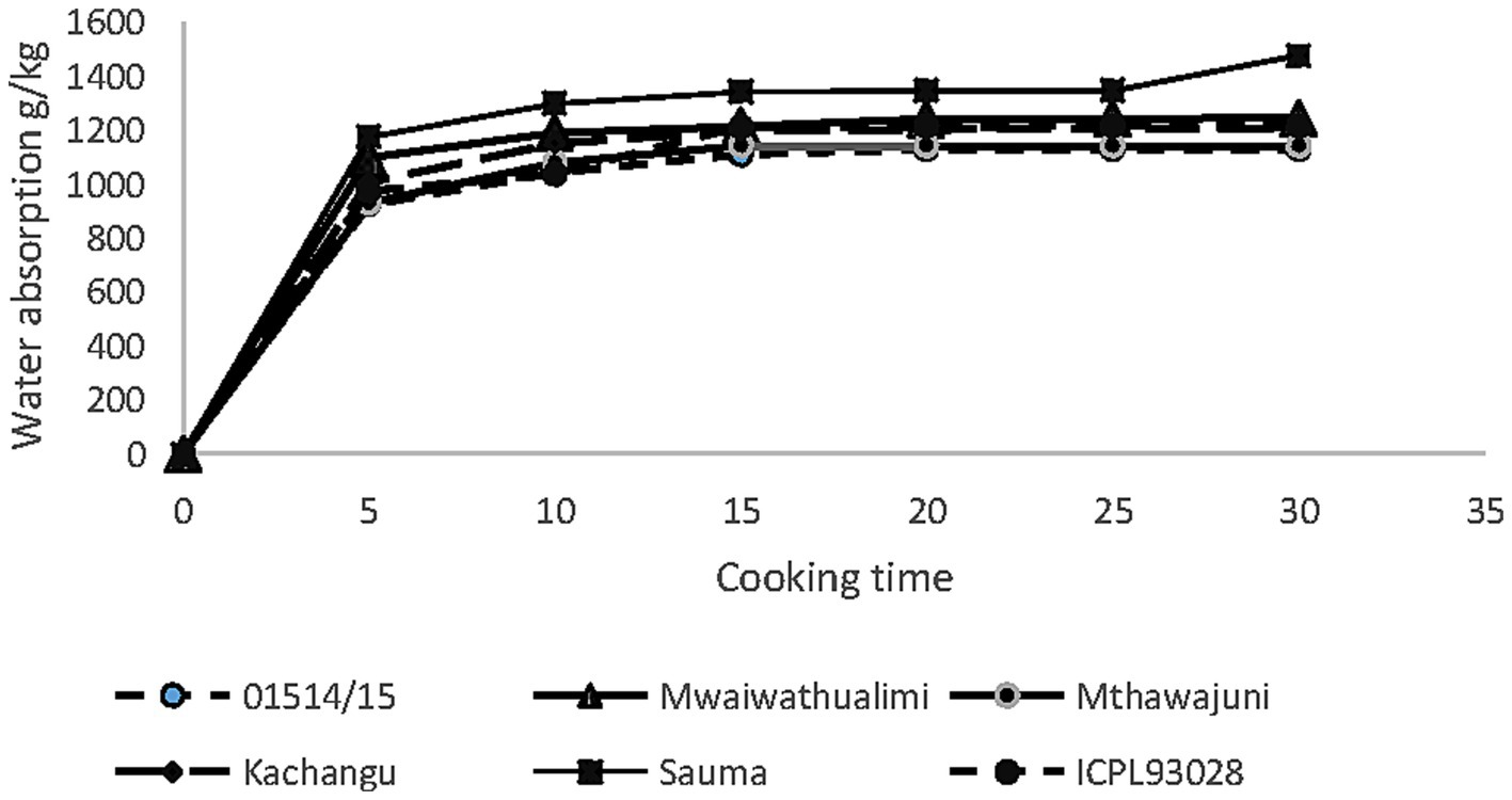 In whole seed cooking trials (Figure 3), water uptake exhibited a pattern with three distinct phases. During the initial 15-min period, ICEAP 01514/15 demonstrated superior water absorption compared to other varieties, while all cultivars showed rapid initial uptake which is attributed to water infiltration through hilum capillaries and surface pores (Devkota et al., 2022). The second phase (15–30 min) was characterized by elevated absorption in Kachangu, Mwaiwathualimi, and ICPL 93026, this happens with the onset of starch gelatinization and protein denaturation processes. Subsequently, water uptake rates declined progressively until reaching equilibrium at 75 min, indicating complete hydration of gelatinized starch and denatured protein matrices.