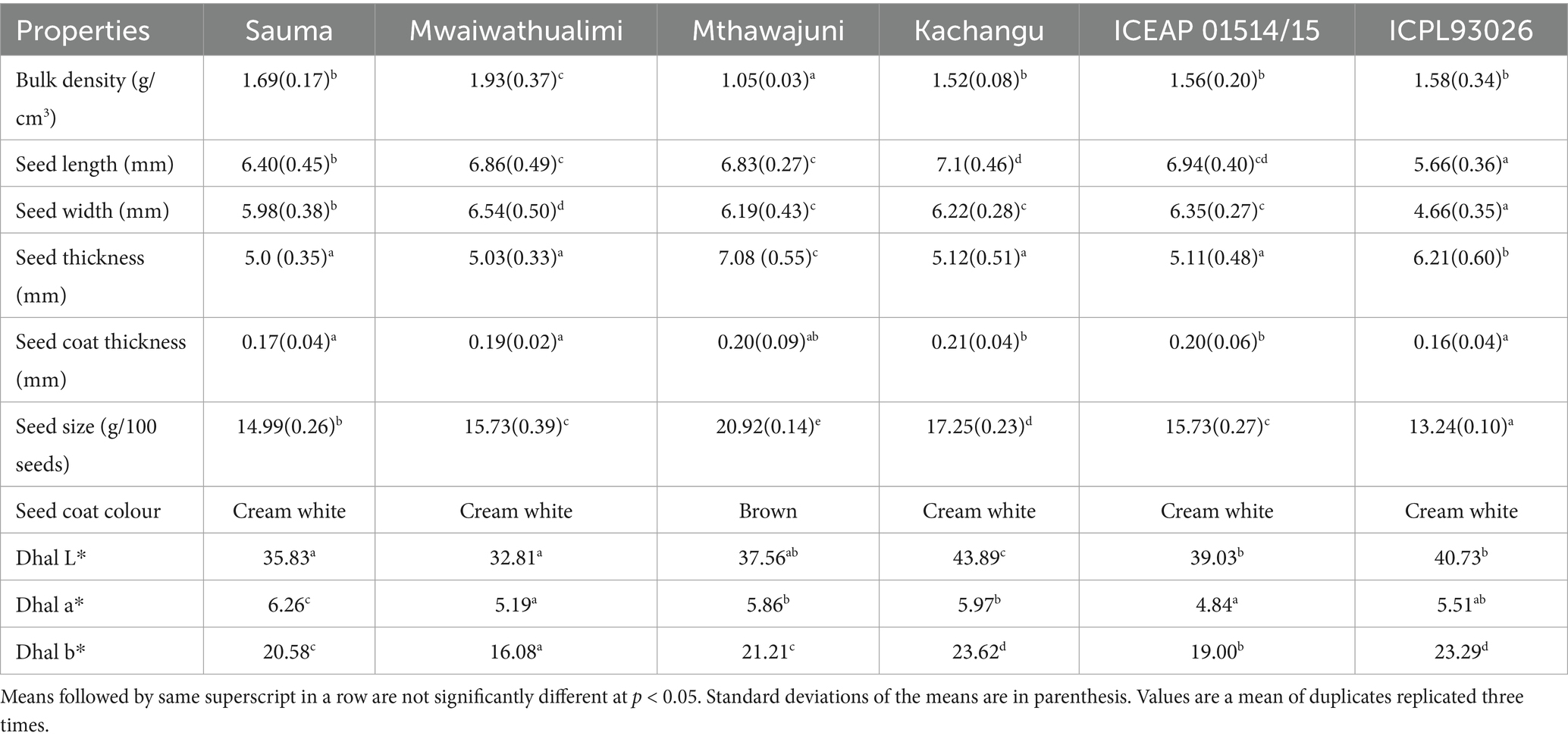Color was determined using a Chroma meter CR- 400 (Konica Monolta Inc) measured values expressed as L*, a*, b* where L* = lightness, a* = redness, and b* = yellowness. The grains were then cut using a razor blade to separate the seed coat and a digital Venier calliper with 0.01 mm accuracy was used to measure seed coat thickness, grain length, breadth, and thickness of 30 randomly selected individual grains per variety (Kaliniewicz et al., 2022).