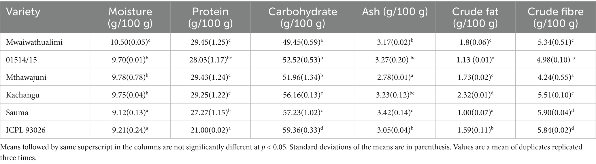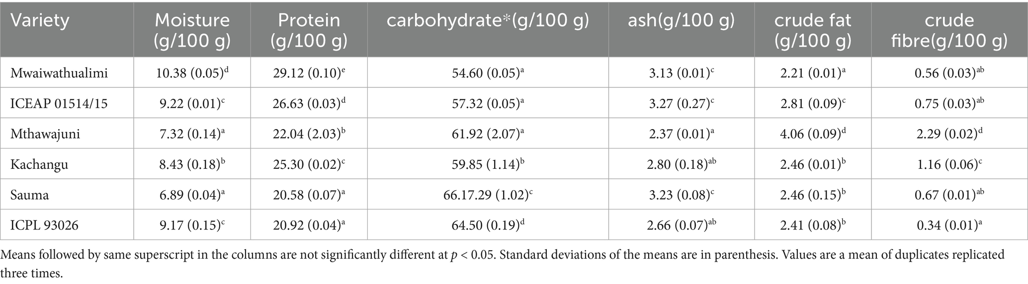 Crude fat content in whole seeds ranged from 1.00 ± 0.70 to 2.34 ± 0.01 g/100 g for Sauma and Kachangu, respectively. For dehulled seeds, significant differences were observed among Kachangu, Sauma, and ICPL 93026 varieties. Mthawajuni exhibited the highest crude fat content (4.06 ± 0.09 g/100 g), while Mwaiwathualimi had the lowest. Interestingly, crude fat content was higher in dehulled seeds compared to whole seeds, contrasting with findings reported from a research done in India (Jawalekar et al., 2020). Since lipids in legumes are primarily stored in cotyledons, this observation suggests that dehulling concentrates the fat content on a unit weight basis. The fat content aligns with established knowledge that legumes are not significant fat sources, except for oil seeds such as groundnut and soybean (Khrisanapant et al., 2019).