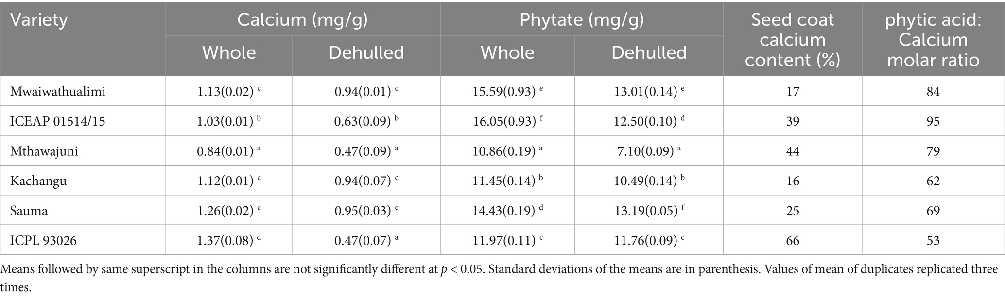 Table 4. Calcium, phytate composition, seed coat calcium content and phytic acid: calcium molar ratio of whole and dehulled pigeon peas.