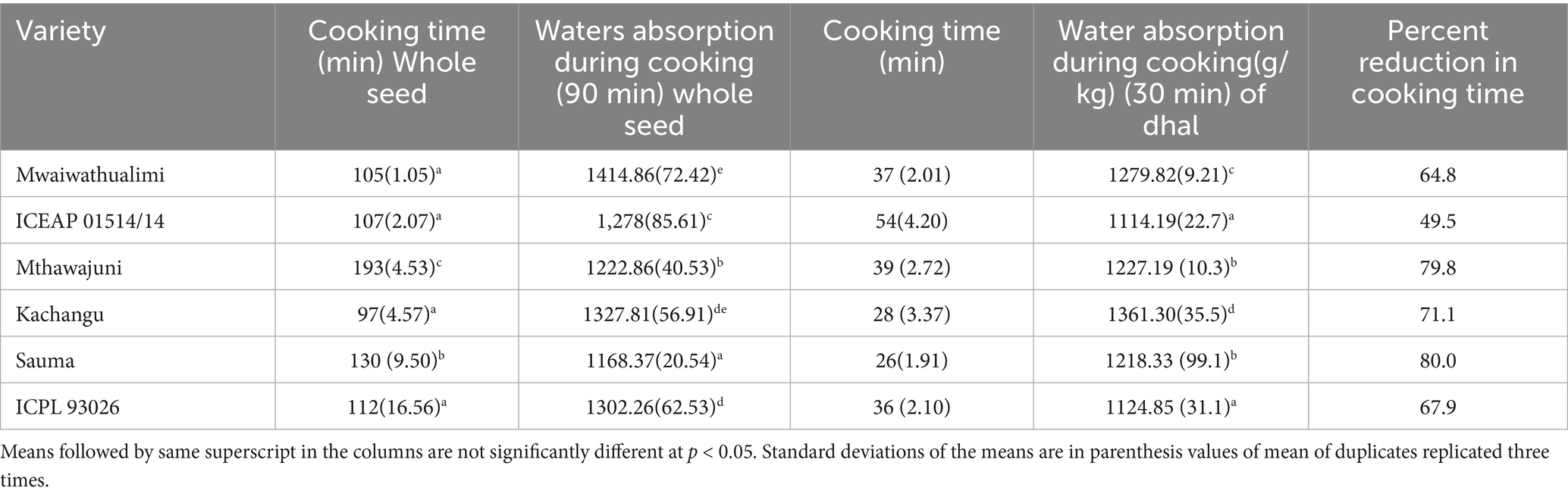 Discussion: This study demonstrates that varietal selection combined with dehulling represents a strategic intervention for optimizing pigeon pea utilization, while enhancing nutritional accessibility and supporting sustainable food systems in resource-constrained environments. Results provide valuable insights for breeding programs targeting improved cooking quality and utilization of pigeon pea varieties for sub-Saharan Africa.