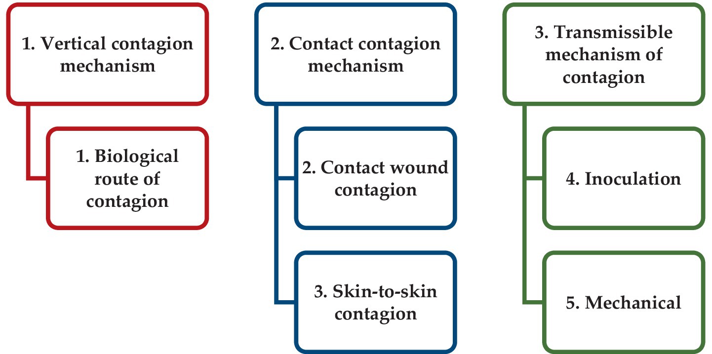 There are many different mechanisms and routes of infectious and parasitic diseases transmission. The prevalence of a particular contagion route will depend on the etiological, morphological and physiological characteristics of the pathogen. Analyses have shown that three mechanisms and five contagion routes are specific for infectious and parasitic diseases of potato (Figure 1).
