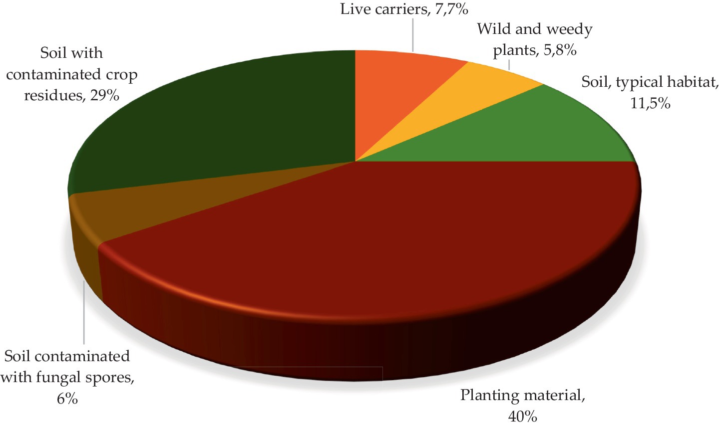 The diagram shows that for the considered pathogens of infectious and parasitic diseases of potato the main reservoirs of infection are planting material (40.4%) and soil (46.1%). It should be noted that soil as a typical habitat is specific for reservoir of infection for 11.5% of pathogens, soil contaminated with fungal spores—for 5.8% of pathogens, and soil with contaminated plant residues—for 28.8% of pathogens. Live vectors, as a reservoir of infection, are characteristic for 7.7% of the pathogens considered, wild and weedy plants—for 5.8% of IPPC pathogens.