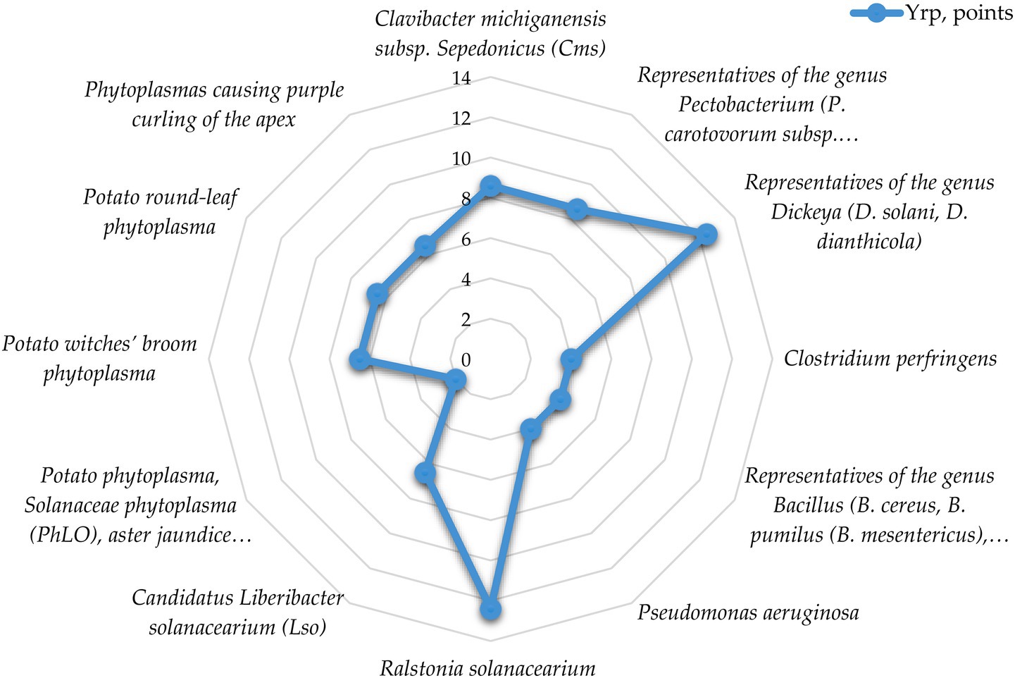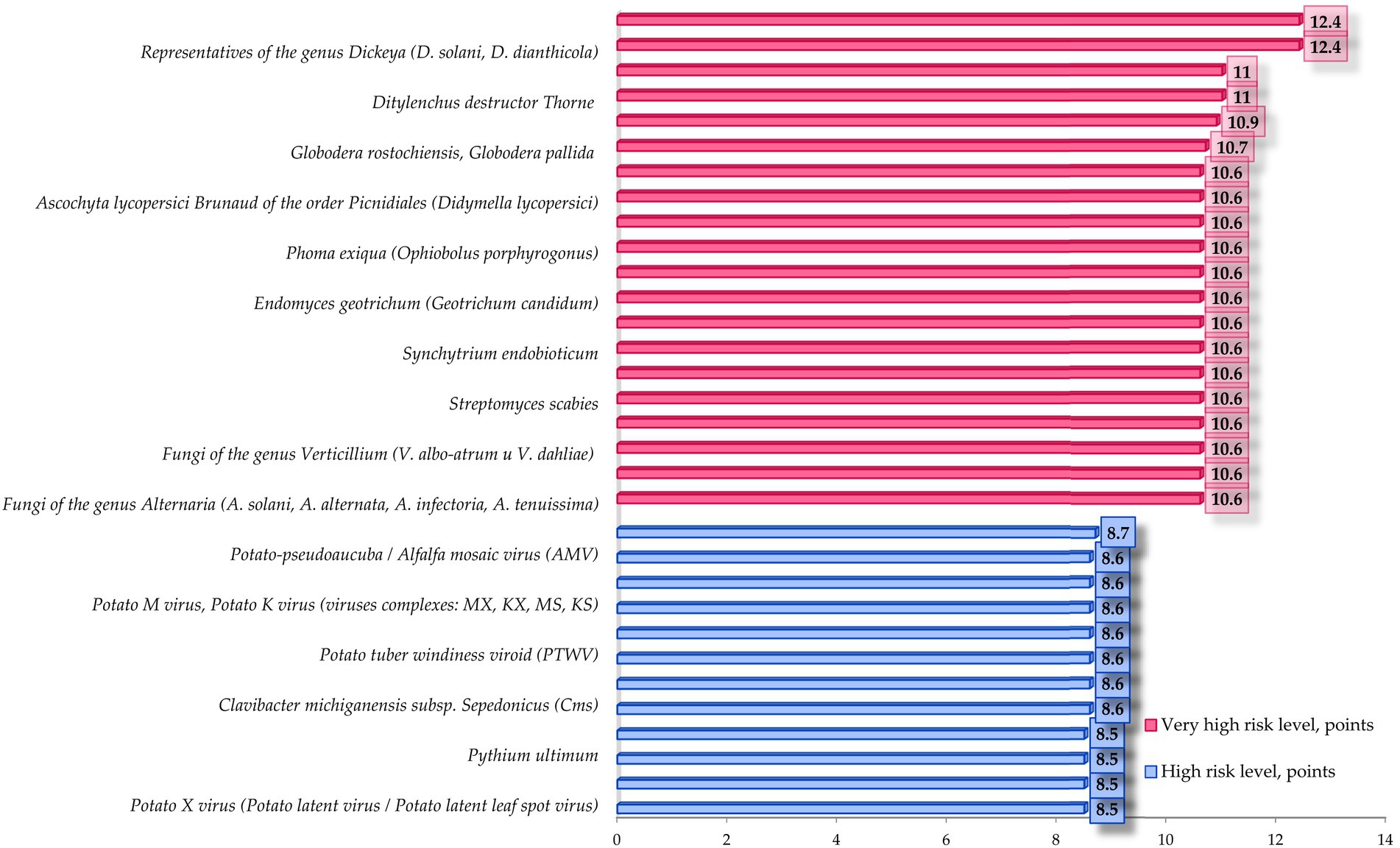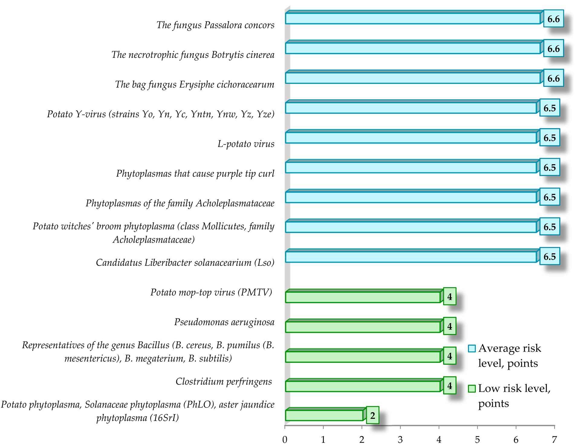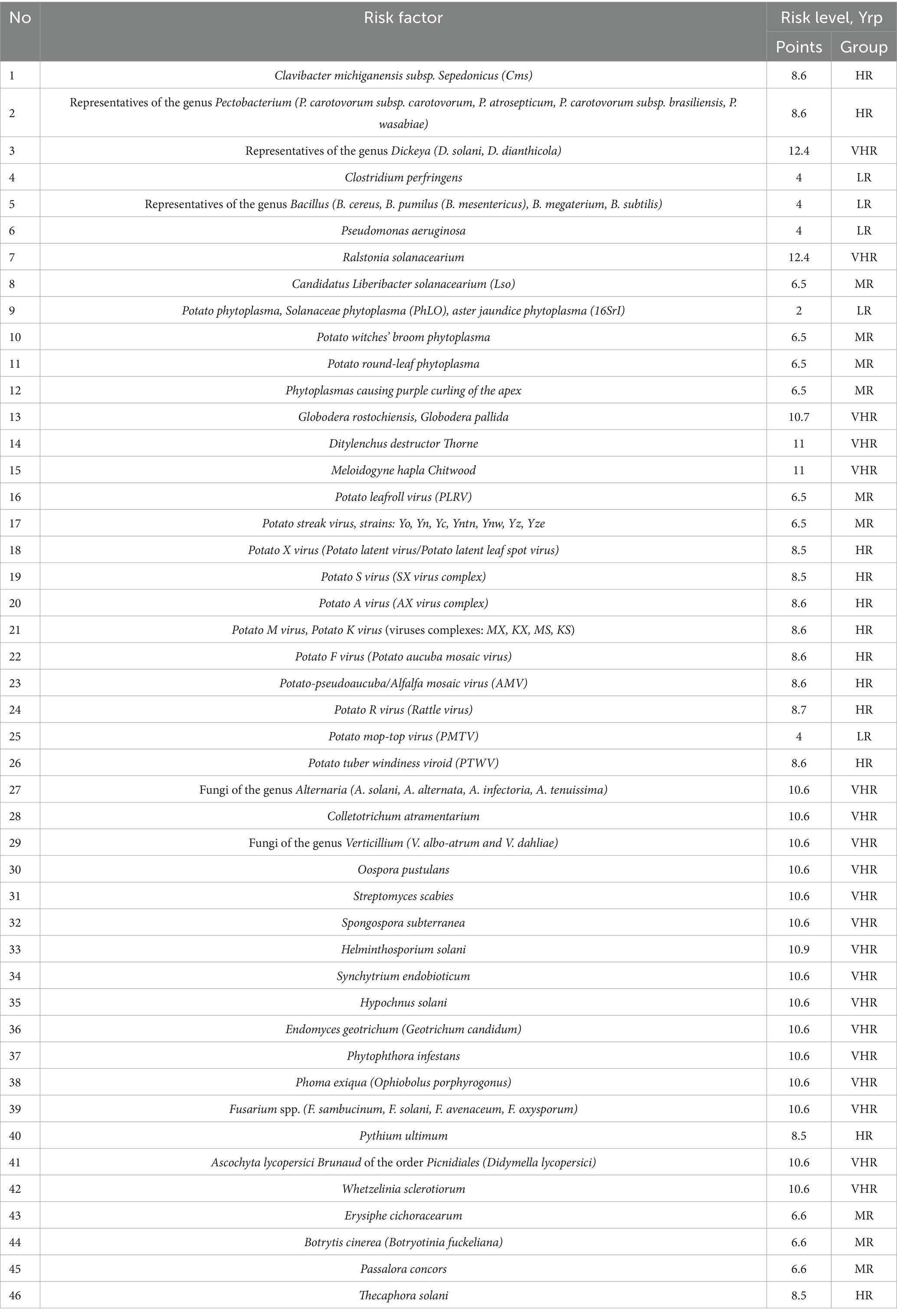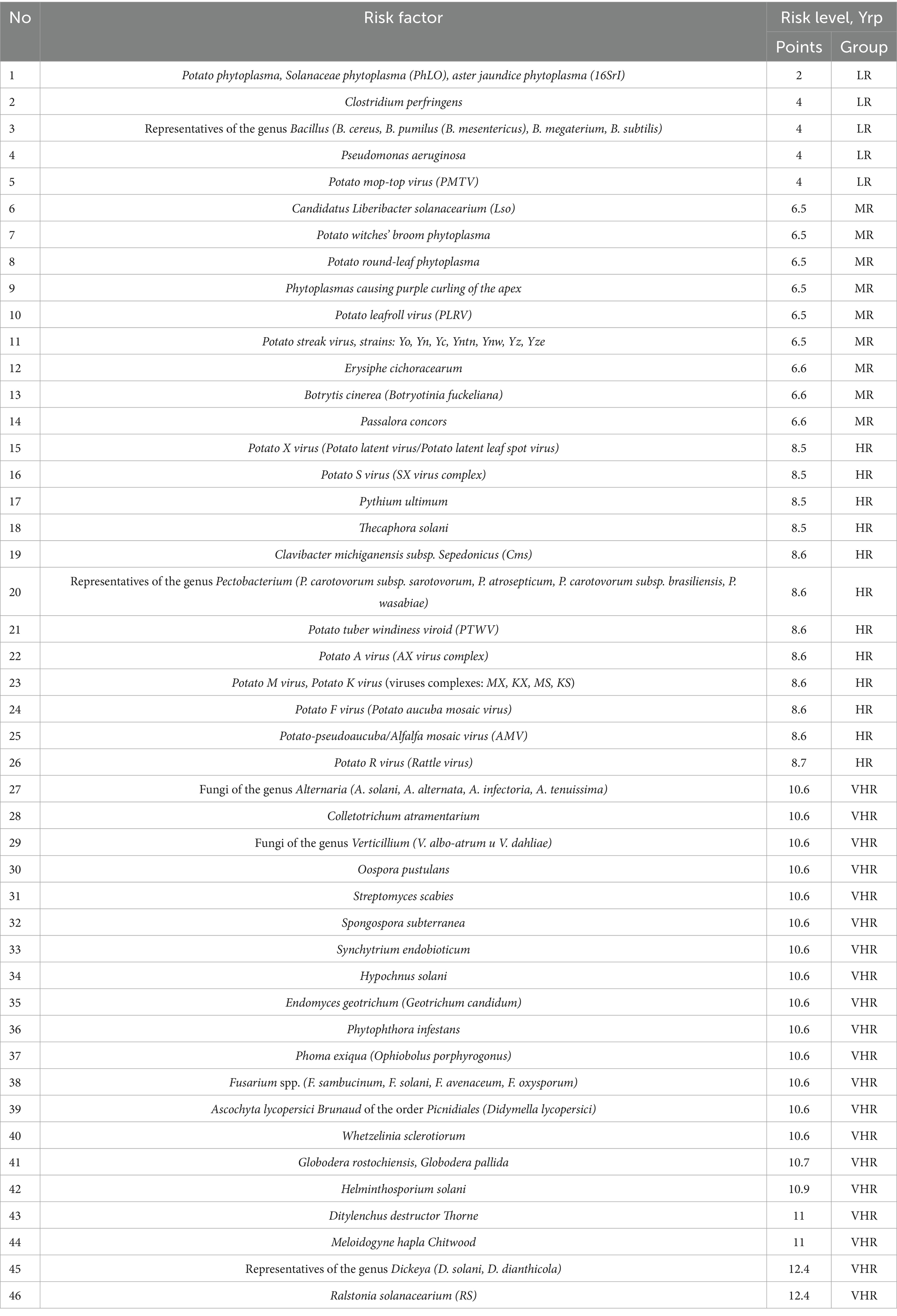 At the same time, the average risk level is mainly found in phytoplasmas, high and very high—in species-specific phytopathogens causing various types of rots, including potato brown rot pathogen (Ralstonia solanacearium, low-temperature strain R2b3 is widespread in our country), which is a quarantine object. The average score for the group is 6.8, which corresponds to an average risk level.
