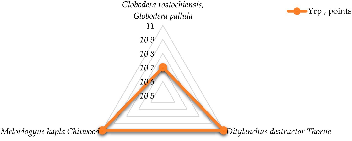 • Fusarium spp. (Yrp = 10.6) causing fusariosis (the disease has a high rate of development and can take a latent form when the tubers are affected, which negatively affects the quality of planting material and is a threat to future yield loss).