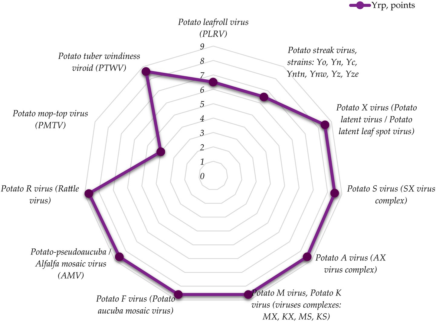 The most specific feature of all the helminthic pathogens is very high risk level (group mean score 10.9). Members of the solanaceae family are parasitized by a variety of helminths, most commonly nematodes. Due to violations of storage and planting standards development of phytohelminthic diseases may happen, such as: globoderosis (causative agents: Globodera rostochiensis and Globodera pallida, TRL = 10.7), ditylenchosis, which is quarantined in some countries (causative agent: Ditylenchus destructor Thorne, TRL = 11) and meilodoginosis (causative agent: Meloidogyne hapla Chitwood, TRL = 11).