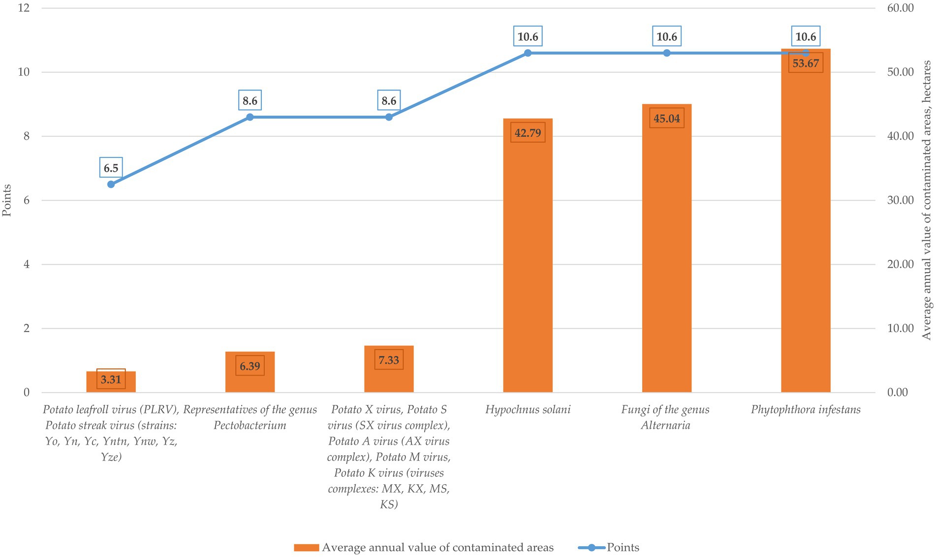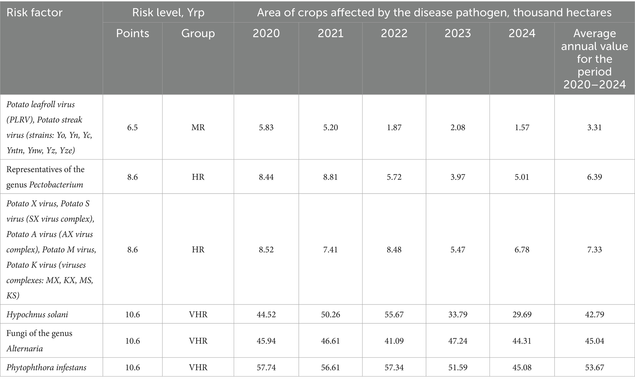 The group with an average risk level (MR—6.5) closes the rating, represented by pathogens of viral etiology causing leaf curling—Potato leafroll virus (PLRV) and leaf mottling—Potato streak virus (strains: Yo, Yn, Yc, Yntn, Ynw, Yz, Yze). Over a five-year period, the average annual value of the affected area of plantings affected by these pathogens is 3.31 hectares.