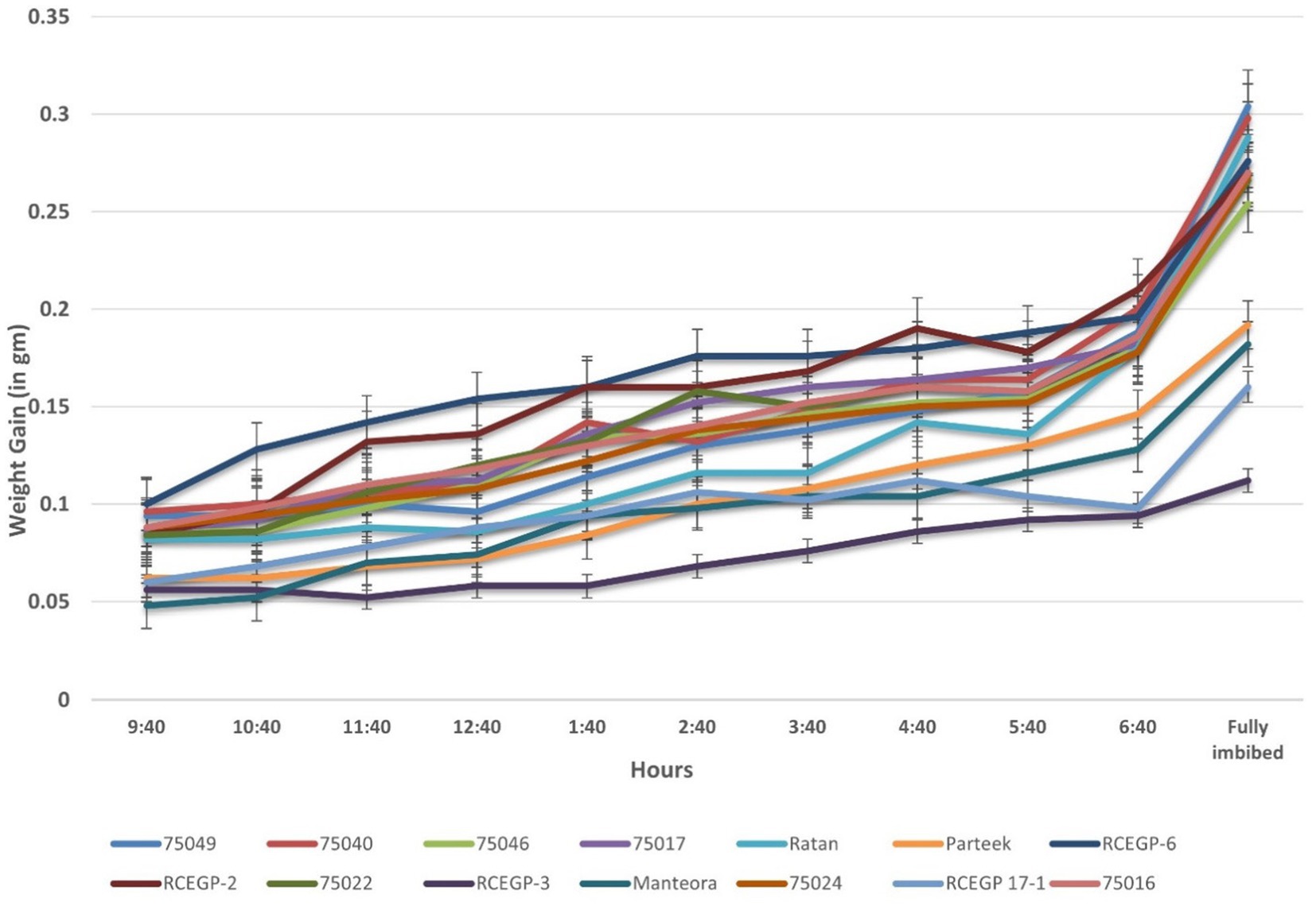 The Figure 1 depicts the imbibition kinetics of various grass pea genotypes by tracking their weight gain (in grams) over time during water uptake. The x-axis represents the imbibition duration from 9:40 to 6:40 (9 h), culminating when seeds reached full hydration (“Fully imbibed”), while the y-axis shows the incremental water absorption (0 to 0.35 gm). Distinct genotypic differences in imbibition rates are evident, with some genotypes like Ratan, RCEGP-2, 75049, 75016 and 75017 exhibiting rapid water uptake, as indicated by their steep initial curves, suggesting superior adaptation to environments requiring quick germination, such as rice fallow systems. In contrast, genotypes like 75046, RCEGP-6 and RCEGP-3 displayed slower imbibition, with gradual weight gain, which may be advantageous in waterlogged conditions where rapid hydration could lead to hypoxia stress.