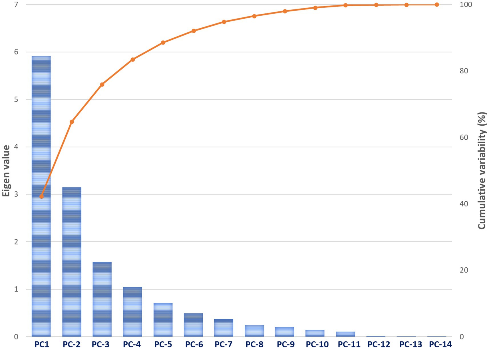 Principal component analysis (PCA) of fourteen morphological and agronomic traits effectively captured the variation patterns within grass pea lines. The Kaiser-Meyer-Olkin (KMO) Measure of Sample Adequacy (>0.5) confirmed the dataset’s suitability for factor analysis. The analysis revealed five significant principal components (PCs) collectively explaining 88.54% of the total variation. PC1 emerged as the most significant component with an eigenvalue of 5.912, accounting for 42.23% of the variance. Subsequent components showed progressively smaller eigenvalues (PC2 = 3.150, PC3 = 1.574, PC4 = 1.048, PC5 = 0.712), following the characteristic scree plot pattern of diminishing returns (Figure 2). The first four PCs alone captured 83.46% of the total variance, demonstrating their effectiveness in summarizing the major patterns of variation in the grass pea lines (Table 6).
