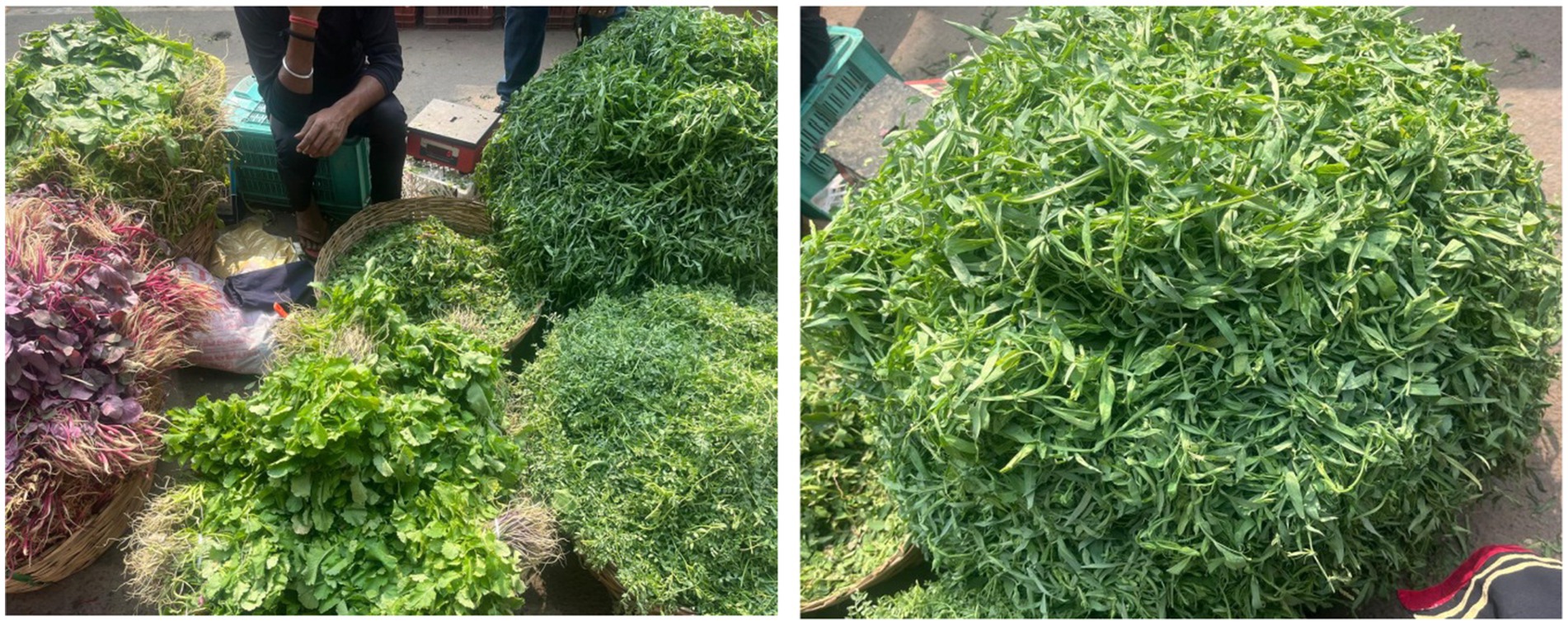 India dominates South Asia’s rice fallows, accounting for 79% (11.65 million ha) of the region’s 15 million ha. These post-kharif rice areas remain uncultivated in rabi due to climate-driven constraints: inadequate irrigation infrastructure, cultivation of the long-duration rice varieties that are harvested late and soil moisture imbalances at the time of crop establishment (Kumar et al., 2025; Ali and Kumar, 2009). Grass pea emerges as a climate-adaptive solution for the marginal systems (Gonçalves et al., 2024). To fully harness the potential of grass pea in revitalizing underutilized rice fallows, we focused on characterizing its dual-purpose utility-both as a leafy vegetable and a grain crop-a trait deeply valued in local food systems (Figure 3). Although limited supplemental irrigation was provided at the flowering and pod formation stages, it was applied only to prevent complete crop failure under exceptionally dry conditions. No irrigation was given during the vegetative phase, thereby allowing plants to experience the natural depletion of residual soil moisture typical of rice-fallow environments (Kumar et al., 2018). Early and strategic leaf picking (1–2 harvests before flowering) not only provides nutritious greens for household consumption but also stimulates lateral branching, which subsequently enhances pod formation and grain yield. This unique agronomic advantage ensures that farmers benefit from immediate nutritional and economic returns (through leafy vegetable sales) while simultaneously securing long-term gains from higher grain productivity (Tripathi et al., 2025). By integrating this dual-purpose trait into breeding programs, grass pea becomes an even more compelling candidate for sustainable intensification of rice fallows, as it maximizes resource use efficiency, improves farm income, and strengthens food security-all while thriving in the challenging post-rice growing conditions characterized by moisture stress, waterlogging, and low-input systems. It offers farmers a high-profit opportunity—yielding 10–11 quintals per hectare at ₹3,500 per quintal. After deducting the low cultivation cost of ₹8,000/ha, farmers can secure a solid ₹30,000/ha profit (Panda et al., 2021).