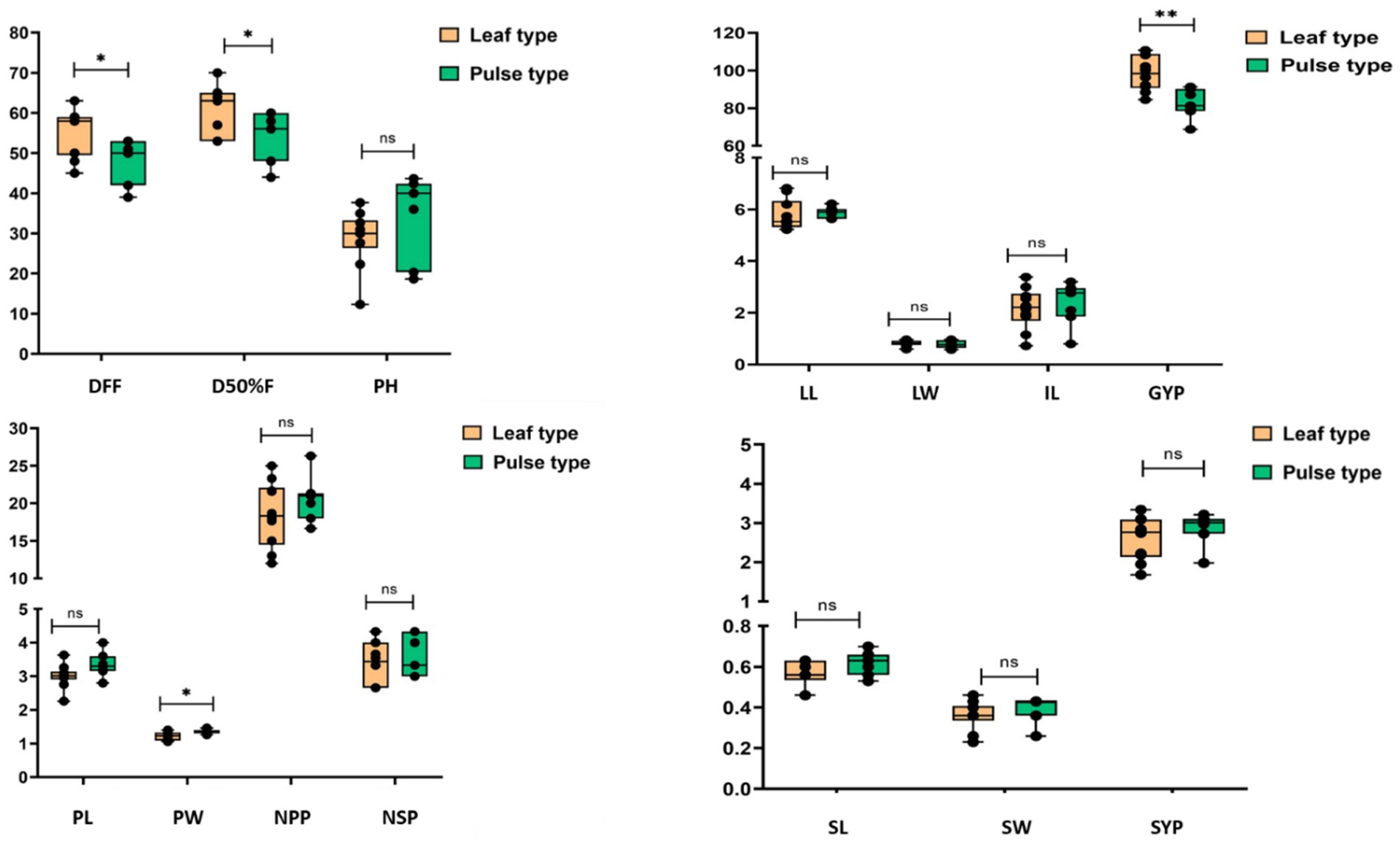 Figure 4. Comparison of agronomic traits between leaf type and pulse type grass pea lines through box and whisker plot.