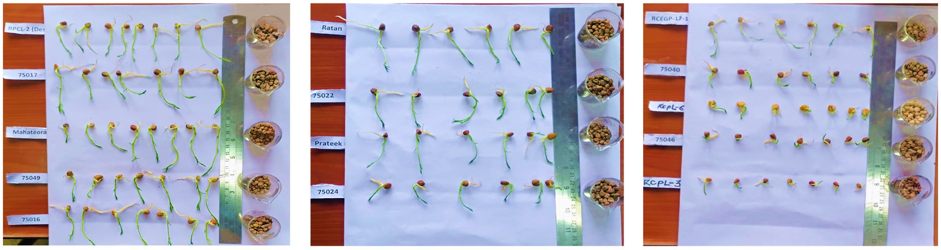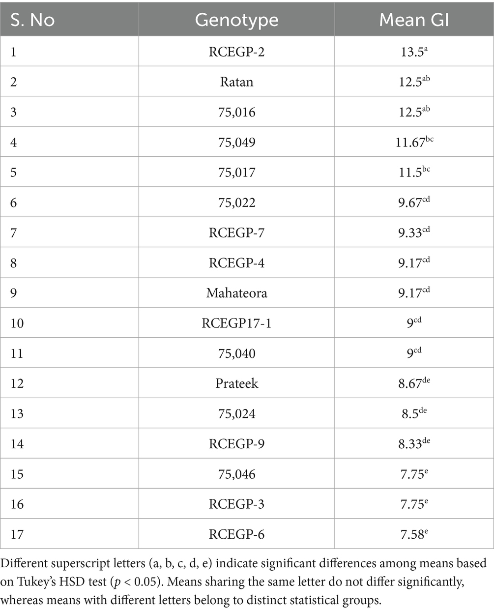 For better understanding, the germination index (GI) was calculated to assess seed vigor and emergence rate. The Table 5 presents the mean GI values of seventeen grass pea (Lathyrus sativus L.) genotypes, grouped statistically using Tukey’s Honest Significant Difference (HSD) test. GI reflects both the speed and uniformity of germination, where higher values denote greater vigor. Significant variation was observed among genotypes, with RCEGP-2 showing the highest GI (13.5), followed by Ratan and 75016, indicating superior seed vigor and rapid emergence. In contrast, RCEGP-6, RCEGP-3, and 75046 exhibited the lowest GI, suggesting poor and delayed germination. These variations highlight the potential for selecting or breeding genotypes tailored to specific moisture conditions, with fast-imbibing types being ideal for drought-prone areas and slower-imbibing types potentially better suited for environments with unpredictable water availability. The findings underscore the importance of imbibition efficiency as a critical trait for improving grass pea’s adaptability across diverse agroclimatic conditions.