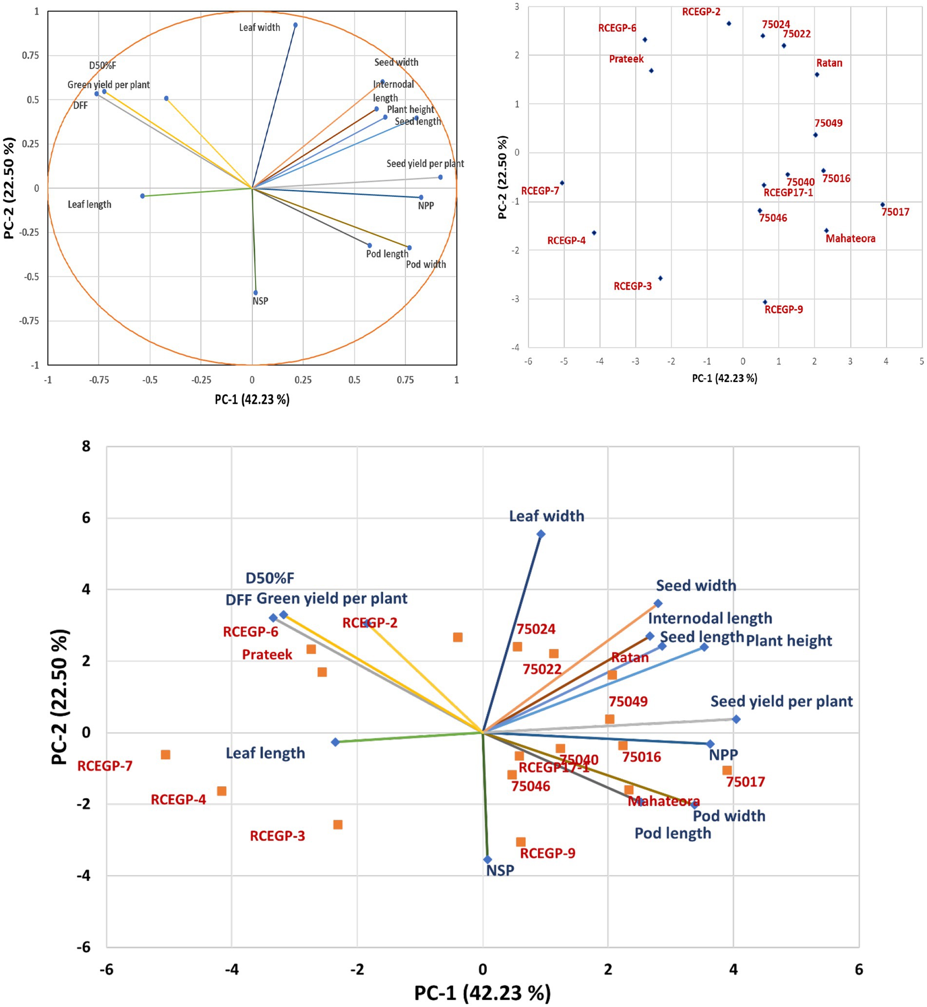 The first principal component (PC1) accounts for the largest proportion of variance at 42.23% and is strongly associated with growth and yield-related traits, showing high positive loadings for plant height (0.805), pod width (0.769), number of pods per plant (0.826), and seed yield per plant (0.921), while displaying strong negative correlations with days to first flowering (−0.761) and days to 50% flowering (−0.724). This suggests that PC1 primarily represents a trade-off between early flowering and high yield potential. The second component (PC2) explains 22.50% of the variation and is dominated by leaf width (0.923) with a negative influence from the number of seeds per pod (−0.590), indicating a separation between plants with broader leaves and those producing more seeds per pod. PC3 contributes 11.24% of the variability and is characterized by positive associations with leaf length (0.687) and pod length (0.654), contrasting with negative loading for internodal length (−0.316). The remaining components (PC4 and PC5) account for smaller portions of the variation (7.48 and 5.08% respectively) and involve more specific trait relationships, such as the influence of green yield per plant on PC4 (0.480) and number of seeds per pod on PC5 (0.521). The analysis reveals that the first two principal components capture nearly 65% of the total variability, highlighting their importance in understanding the underlying structure of the data and identifying key traits for potential crop improvement strategies focused on yield, flowering time, and morphological characteristics (Table 6).