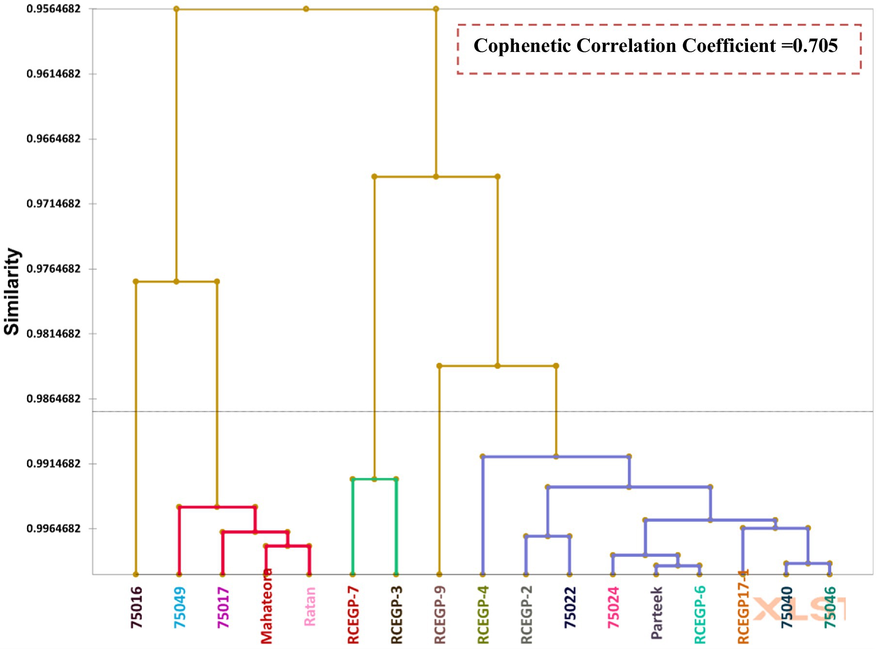 Analysis of inter-cluster distances further illuminates these relationships, with the zero diagonal values confirming tight genetic cohesion within each cluster. The most pronounced genetic divergence appears between Cluster II and Cluster III (distance = 43.62), marking them as the most distinct groups. Conversely, Cluster III and Cluster V show the closest relationship (distance = 18.55), potentially sharing valuable traits like drought tolerance or yield potential. The isolated nature of Clusters IV and V, each containing just one genotype, highlights their potential as unique genetic material for targeted breeding objectives. The high cophenetic correlation coefficient (0.705) confirmed strong clustering reliability, showing the UPGMA analysis effectively captured genetic relationships among the genotypes.