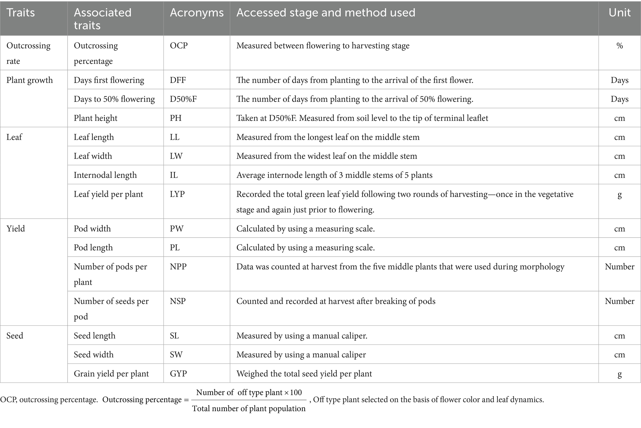 The study was conducted from 2023–24 to 2024–25 in experimental farm of ICAR Research Complex for Eastern Region, Patna, Bihar India (25°35′N, 85°05′E, 51 MSL). The region has a subtropical climate with annual rainfall of 1,167 mm (70–75% during July–September), temperatures ranging from 7.4–39.6 °C, and relative humidity of 50–80.5%. The silty loam soil (0–15 cm depth) had a pH of 7.22 and EC of 0.17 dS m−1. The experiment was carried on for two consecutive years 2023–24 and 2024–25 in Rabi season. Seventeen grass pea (Lathyrus sativus L.) genotypes (Table 1), sourced from farmers field (Passport data is available in Supplementary file) and ICARDA gene banks were evaluated over two consecutive growing seasons (2023–24 and 2024–25). A randomized row-column alpha lattice design with two replications was employed for field trials. Individual plots measured 3 m × 2 m, containing eight rows spaced at 0.50 m intervals, with 0.50 m alleys separating adjacent plots. In both years of the study, sowing was conducted in the last week of November immediately after rice harvest to utilize residual soil moisture. Seeds were manually dibbled at a uniform depth of 2 cm with 10 cm row spacing. A basal fertilizer dose of 20:40:40 kg/ha (N:P₂O5:K2O) was applied. Standard agronomic practices for rainfed grass pea cultivation were followed, with manual weed control as required. During periods of water deficit at critical growth stages, supplemental irrigation was applied via sprinkler system to maintain plant viability. No irrigation was provided during the vegetative growth stage, allowing the crop to grow solely on residual soil moisture typical of rice-fallow conditions. Supplemental irrigation was applied only at the flowering and pod formation stages via a sprinkler system to maintain plant viability and prevent complete crop failure. The system was calibrated to deliver approximately 12 mm of water per irrigation event. The irrigation rate (L m−2 h−1) was measured and multiplied by the duration of application to estimate the total water applied per plot, expressed in millimeters (1 L m−2 = 1 mm of water). Phenotypic data were recorded for multiple agronomic traits across both seasons. For each growing season, observations were categorized into four distinct datasets (Table 2) to facilitate comprehensive analysis. (i) Plant growth parameters: days first flowering (DFF), days to 50% flowering (D50%F), plant height (PH) (ii) Leaf parameters: leaf length (LL), leaf width (LW), internodal length (IL), leaf yield per plant (LYP) (iii) Yield parameters: pod length (PL), pod width (PW), number of pods per plant (NPP), number of seeds per pod (NSP) (iv) Seed parameters: seed length (SL), seed width (SW), grain yield per plant (GYP) recorded in 10 random seeds per plot. The percentage of outcrossing was determined by counting off-type plants, which were characterized by different flower color and leaf structure, and dividing that number by the total plant population, then multiplying by 100. Recommended agronomical practices were followed, including plot preparation, fertilization, and application of fungicides and insecticides. To ensure individuality of each entry, care was taken to segregate them properly. To avoid the influence of border effects, 10 randomly selected plants were taken from each genotype to measure their morphological traits and the average was recorded. Grass pea was harvested manually at 30–35 DAS (vegetative stage, pre-flowering) for leafy vegetables by cutting stems 5–10 cm above ground. For seed production, harvest occurred at 120 DAS when 80% pods turned yellow-brown; plants were cut at ground level, sun-dried 3–5 days, then threshed.