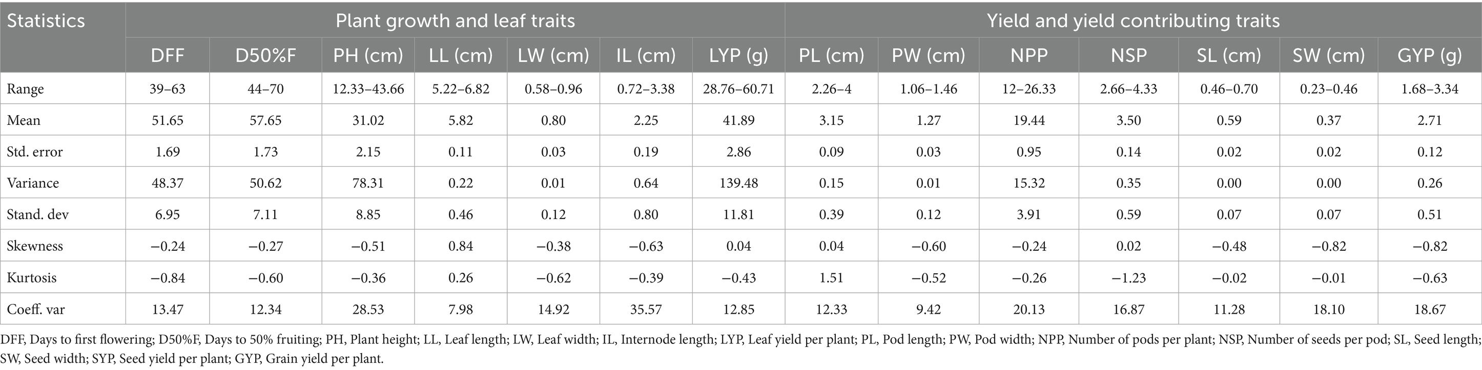 The evaluation of grass pea genotypes reveals distinct phenotypic variations that can be strategically utilized for different production goals in rice fallow systems. In the present study, significant differences existed among lines for fourteen quantitative traits (Figure 4). The observed diversity in flowering time (39–63 days) presents a valuable opportunity to match genotypes with specific growing windows—late-maturing types are better suited for leafy vegetable production due to their extended vegetative phase and taller stature, while Earliness is vital for escaping terminal heat stress in short-winter climates, allowing the crop to complete flowering and pod-filling before the onset of damaging high temperatures (Gonçalves et al., 2025). The evaluated grass pea lines demonstrate potential for different utilization purposes in rice fallow systems. For specific grain production, early-flowering genotypes like 75017 (42 DFF, 3.21 g seed yield) and 75049 (45 DFF, 3.34 g seed yield) are optimal, combining high pod numbers (26.33 and 21.66 respectively) with excellent seed size and yield stability. Leaf-optimized lines are characterized by later maturity (DFF > 55 days) and superior vegetative traits, viz. 75024 (60.71 g green yield) and RCEGP-6 (60.43 g green yield, 0.96 cm leaf width), which support multiple harvests of quality nutritious green. Dual-purpose genotypes such as Mahateora (42 DFF, 2.98 g seed yield, 54.91 g green yield) and RCEGP-2 (59 DFF, 2.75 g seed yield, 46.45 g green yield) offer balanced performance, maintaining intermediate phenology with optimum productivity for both leaves and grain. Studies reveal grass pea’s genetic diversity for yield and growth traits globally (Hanbury et al., 1999; Arslan et al., 2022; Parihar et al., 2013) and regionally (Abate et al., 2018; Tadesse and Bekele, 2003), though leafy vegetable characteristics remain limited investigated.