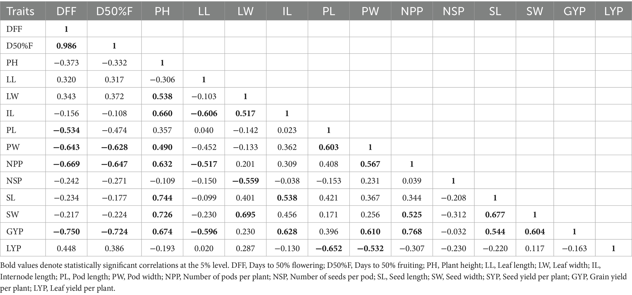 The development of improved grass pea varieties necessitates simultaneous selection for multiple traits to achieve optimal trait combinations and understand potential pleiotropic effects (Akhtar et al., 2011; Diriba et al., 2014). Correlation analysis, through determination of Pearson’s correlation coefficients (r), provides a quantitative measure of linear dependence between phenotypic traits, indicated the potential of multiple trait selection (Maleki et al., 2024).