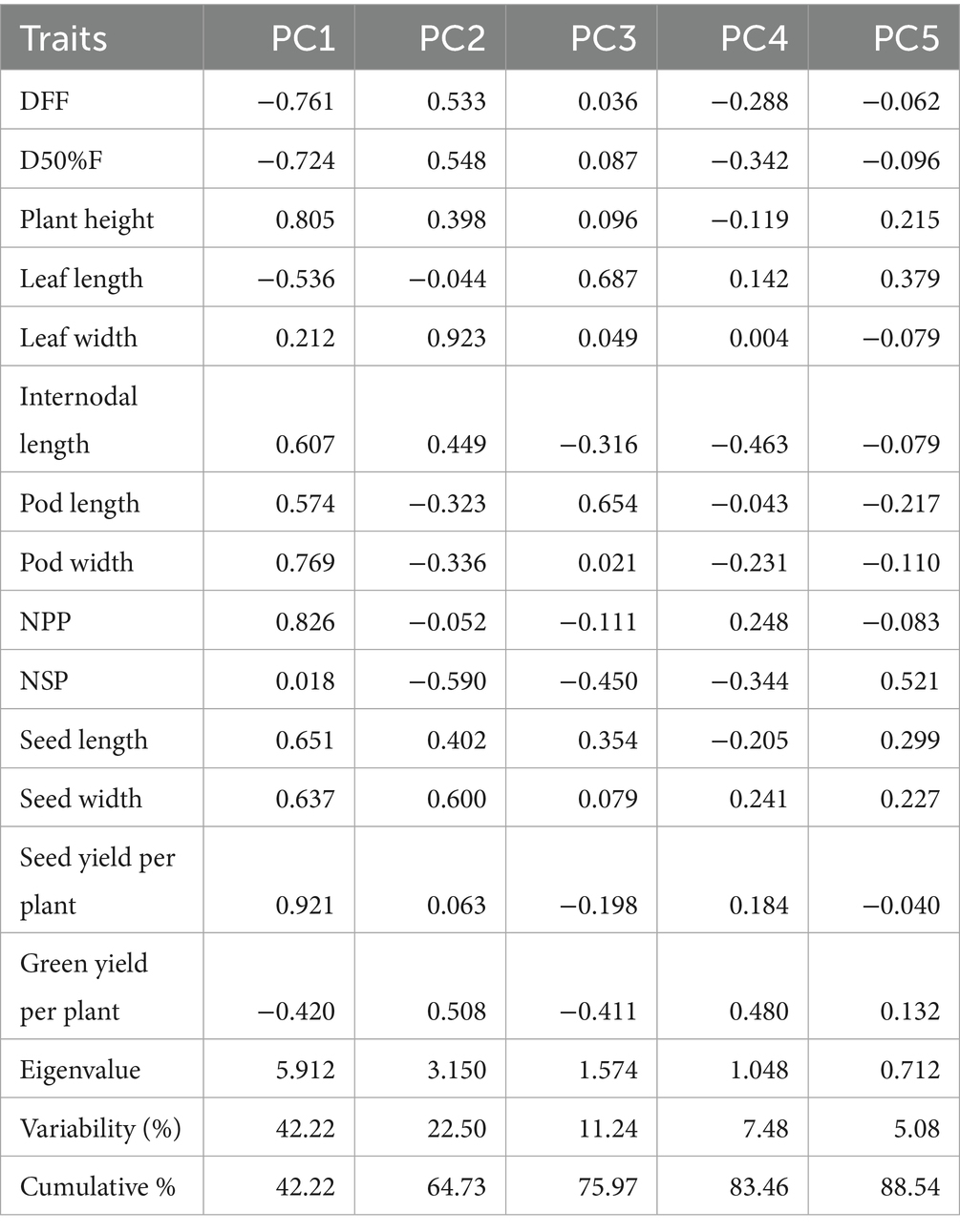 Principal Component Analysis provided a robust framework for identifying key selection targets, with the first two components explaining 64.73% of total variation. PC1 (42.22% variance) strongly associated high yield traits (grain yield loading = 0.921) with early flowering (DFF loading = −0.761), validating conventional breeding priorities while quantifying their relative importance. PC2 (22.50% variance) effectively separated broad-leaved genotypes (leaf width loading = 0.923) from those with higher seed production (number of seeds per pod loading = −0.590), suggesting independent genetic control of these characteristics. Principal components with eigenvalues greater than 1 (Kaiser criterion; Brejda et al., 2000) and those accounting for at least 5% of the total variation (Sharma et al., 2005; Gui et al., 2010) were retained for further analysis. Confirm the reliability of these patterns for breeding decisions, supporting their use in developing cultivars for sustainable production systems. In a PCA biplot (Figure 6), trait arrows indicate the direction of increasing trait values, with genotypes positioned closer to an arrow exhibiting higher expression of that trait. Longer arrows represent traits with greater contributions to overall variation, highlighting their importance in genotype differentiation. The angular relationships between arrows reveal trait correlations: acute angles denote positive associations, obtuse angles (near 180°) indicate negative relationships, and right angles (~90°) suggest little to no correlation. This visualization aids in identifying key traits for selection and understanding trade-offs in breeding programs (Yan and Kang, 2002). Thus, the prominent characters coming together in different principal components and contributing toward explaining the variability have the tendency to remain together (Figure 7).