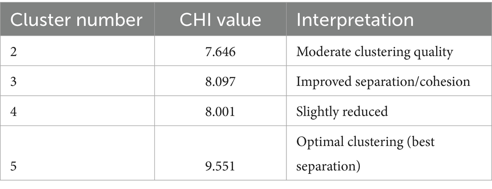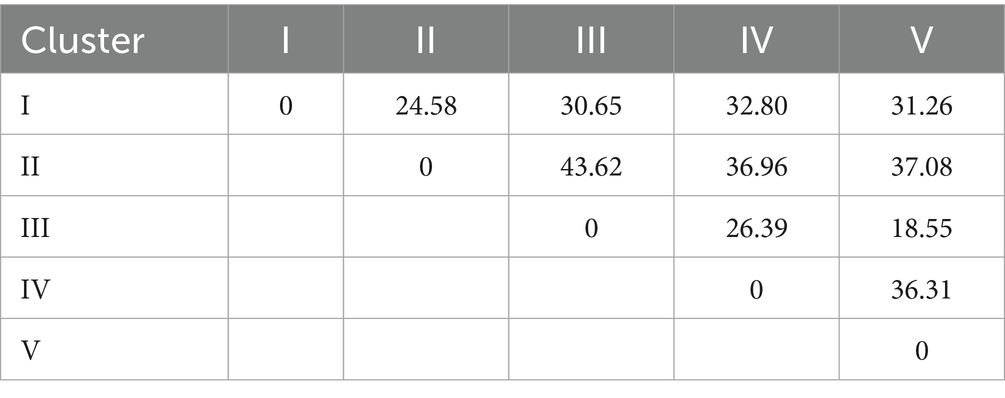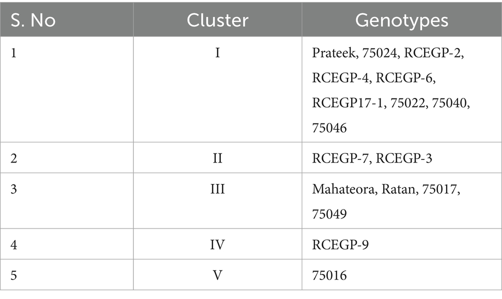 Cluster analysis was performed using the UPGMA (Unweighted Pair Group Method with Arithmetic Mean) algorithm to elucidate genotypic relationships. The validity of the resulting clusters was statistically verified using the Calinski-Harabasz Index (CHI) Table 7, which quantitatively assesses between-cluster separation versus within-cluster cohesion. This combined approach provides robust evidence that the observed groupings reflect true differences among genotypes. The study reveals important insights into the genetic diversity of grass pea lines through cluster analysis, with significant implications for breeding programs. The genotypes were grouped into five distinct clusters based on their genetic characteristics, showing varying levels of relatedness (Tables 8, 9). Cluster I emerged as the largest group, comprising nine closely related genotypes (Prateek, 75024, RCEGP-2, RCEGP-4, RCEGP-6, RCEGP17-1, 75022, 75040, and 75046), indicating strong genetic similarity among these accessions. In contrast, Cluster II contained just two genotypes (RCEGP-7 and RCEGP-3), while Cluster III included four (Mahateora, Ratan, 75017, and 75049). The remaining two clusters each contained a single unique genotype—RCEGP-9 in Cluster IV and 75016 in Cluster V—suggesting these may represent particularly distinct genetic resources.