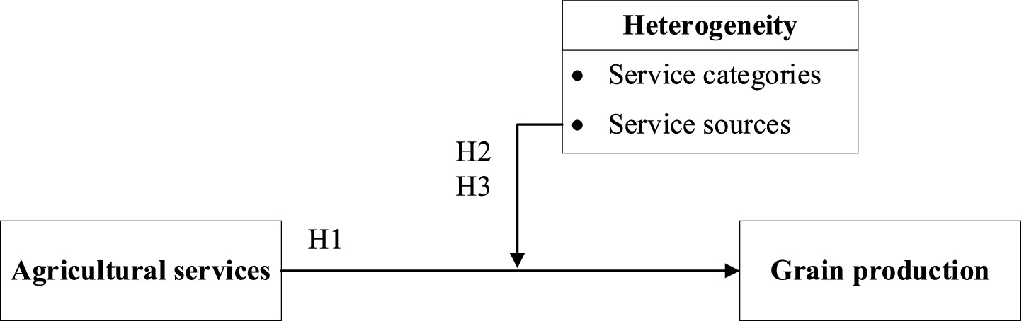 Introduction: Agricultural services have a substitution effect on agricultural labor. But few studies have considered the impact of agricultural services on grain production from the perspective of heterogeneity in services categories and sources. Therefore, this study examines the impact of agricultural services on grain production in China and explores its heterogeneous effects.