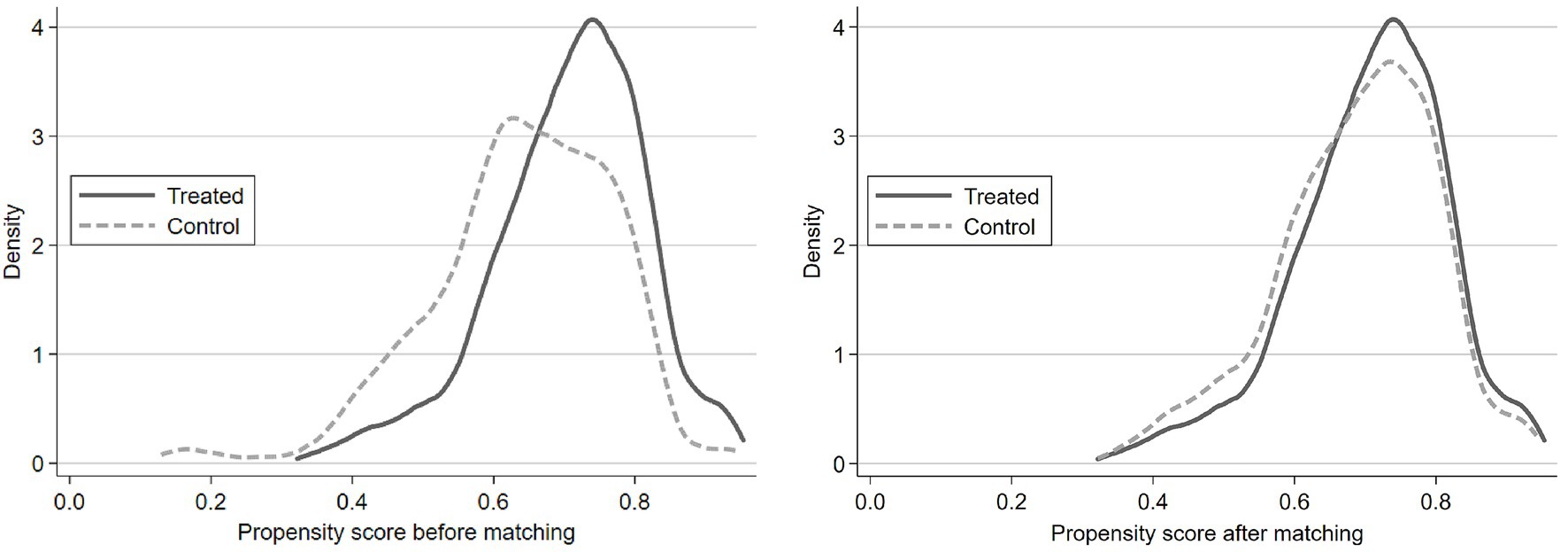 Furthermore, Figure 2 illustrates the kernel density functions of the treatment group and the control group based on pre- and post-matching of the two groups, respectively. The kernel density functions of the two groups were significantly different before matching. After matching, the kernel density functions of the two groups were a lot closer, indicating that the characteristics of the variables were similar in the two groups after matching. This means that there was no systematic difference between the treatment and control groups after matching, thus satisfying the balance test.