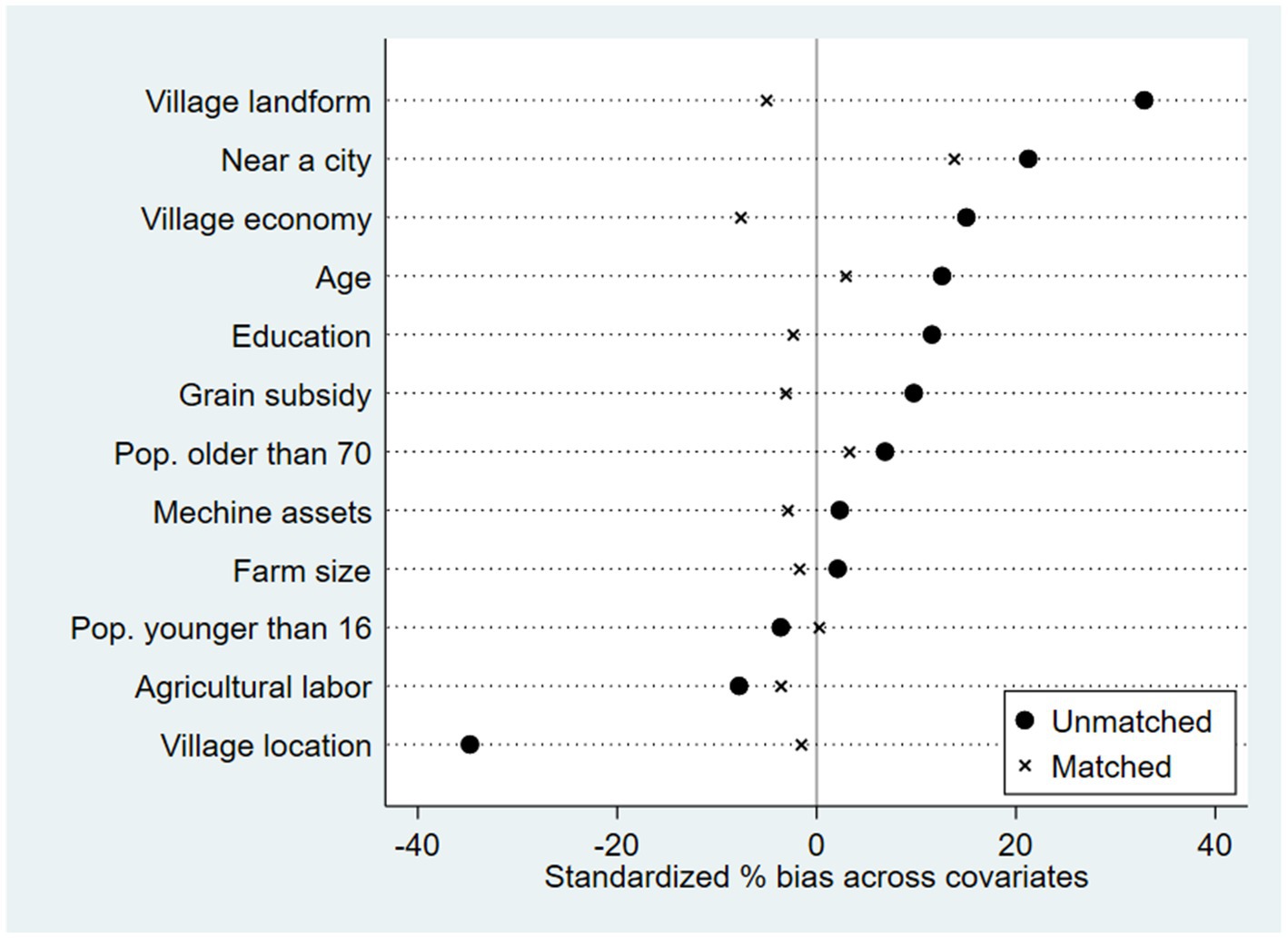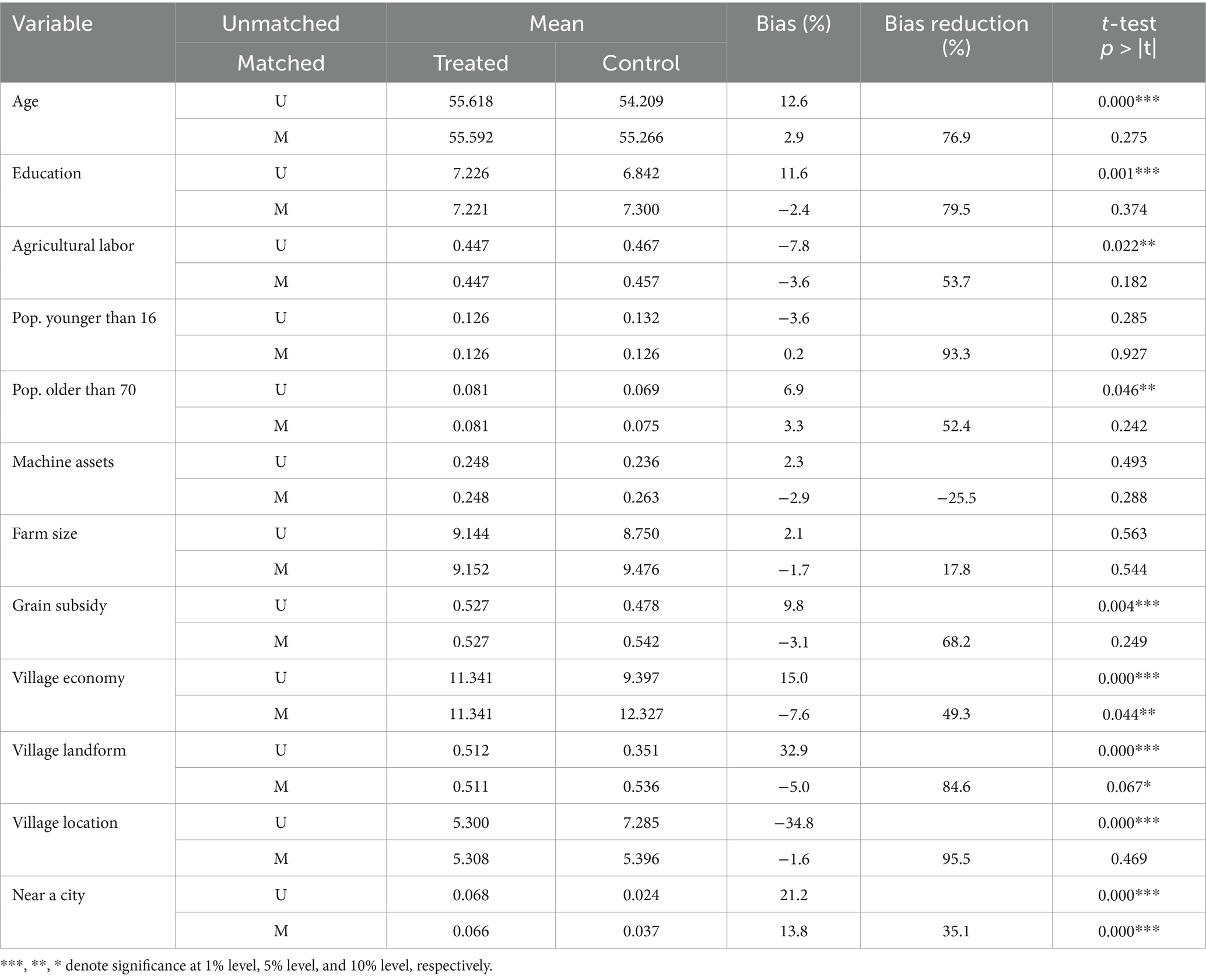 Finally, the PSM quality indicators before and after matching are reported in Table 5. Except for the machine assets variable, the bias of all variables after matching decreased substantially. In addition, the variables including age, education, agricultural labor, Pop. older than 70, grain subsidy, and village location were significantly different at the 1% between the control group and treatment group before the matching, and all of them were insignificant after matching. Meanwhile, according to the Figure A1, the distribution of standardized deviations of each variable before matching was relatively discrete. However, after applying the kernel-based matching method, the standardized deviations of each variable were less than 10%, and most of them were near the 0 value, which shows a significant reduction compared with the pre-matching period.