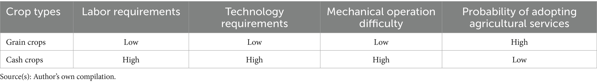 In the actual production process, as the basic unit of agricultural operation, farmers often analyze the feasibility and convenience of grain production according to the maximization of income and their own resource endowment. Cash crops offer high profit margins but require high-tech planting techniques, the lengthy growth cycle and a significant number of manual labor inputs at the early stages of production, which result in higher capital and time costs when purchasing agricultural services. In contrast, grain crops have relatively low labor and technology requirements, and agricultural machinery has a stronger substitution effect on labor (Zhang et al., 2023). That is to say, the current grain cultivation has a more mature and perfect production technology and operational processes that facilitate large-scale batch operation of machinery (Zhou et al., 2023). This is conducive to the services suppliers undertaking a wider range of grain growers in the production service business. Overall, as the market for agricultural services improves, grain crops can reduce the cost of production services through more concentrated labor hours and more labor substitution. Therefore, farmers who have a demand for agricultural services tend to choose grain crops with lower costs and risks and are more adaptable to the characteristics of service supply in order to realize their expected returns (Li et al., 2024). Based on the above inference, the following hypothesis is put forward in this study: