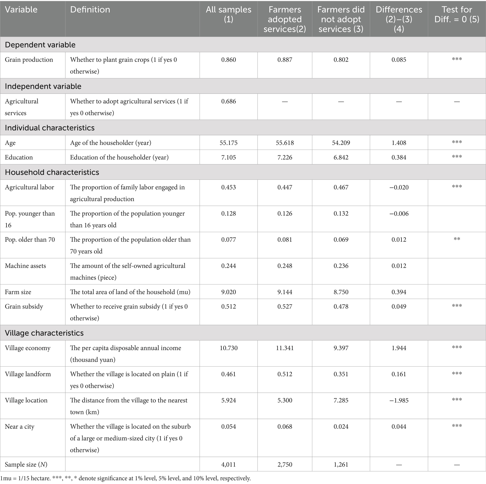 According to the existing studies, our paper mainly controls for individual, household, and village characteristics, which are deemed to influence both agricultural services and grain production (Wu and Meng, 1996; Qiu et al., 2020; Yang et al., 2020; Fan et al., 2023). The detailed definitions of the variables are presented in Table 2.