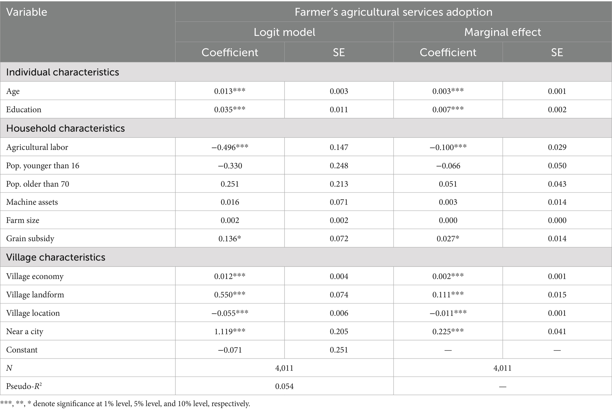 The logit model and marginal effect results are reported in Table 3. On the individual level, the age and education of the householder were positively related to farmers’ agricultural services adoption at the 1% level. And for each unit increase in education and age, the probability of farmers adopting agricultural services increased by 0.3 and 0.7%, respectively.