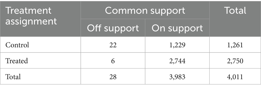 Firstly, the distribution of predicted propensity scores shows a large common support of propensity scores between the farmers adopted agricultural services and farmers did not adopt agricultural services. As a result, only 22 observations off support in control group and 6 observations off support in treatment group, and all the 28 observations not in the common support region were excluded from the analysis (the details see the Table 4). Table 4 shows a significant overlap between the two distributions with very few off-support observations, confirming high common support. This means that the common support assumption is satisfied.