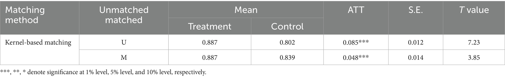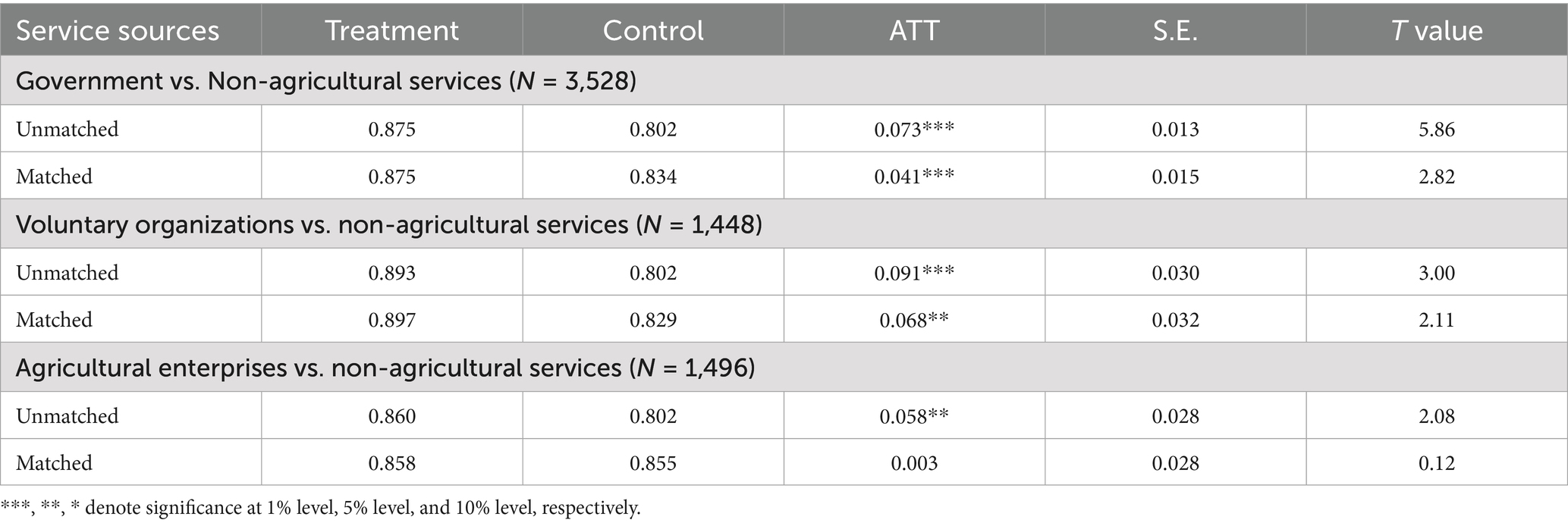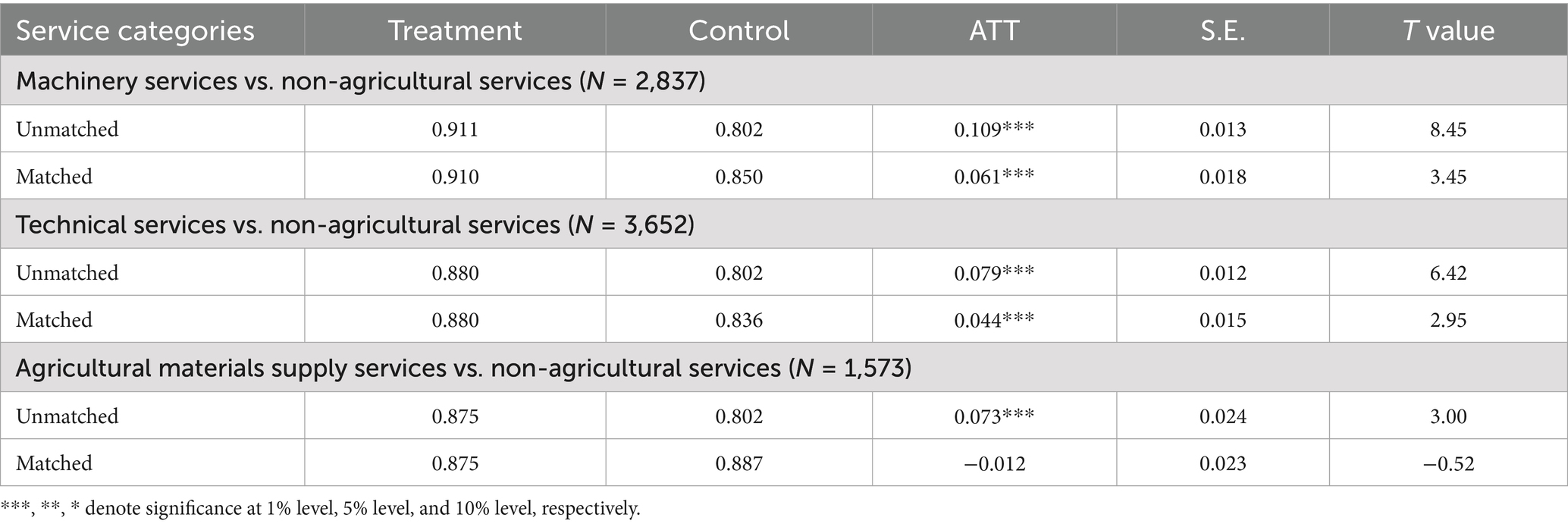 The overall evidence suggests that the matching process successfully achieved covariate balance by eliminating potential bias between the treatment groups and control groups arising from observed variables. Next, we estimate the treatment effect of agricultural services on grain production.